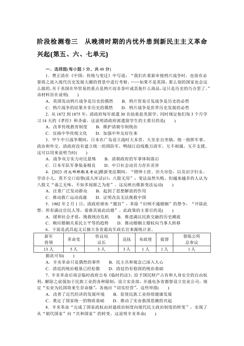 首页高中历史高一历史必修中外历史纲要(上)阶段检测卷三