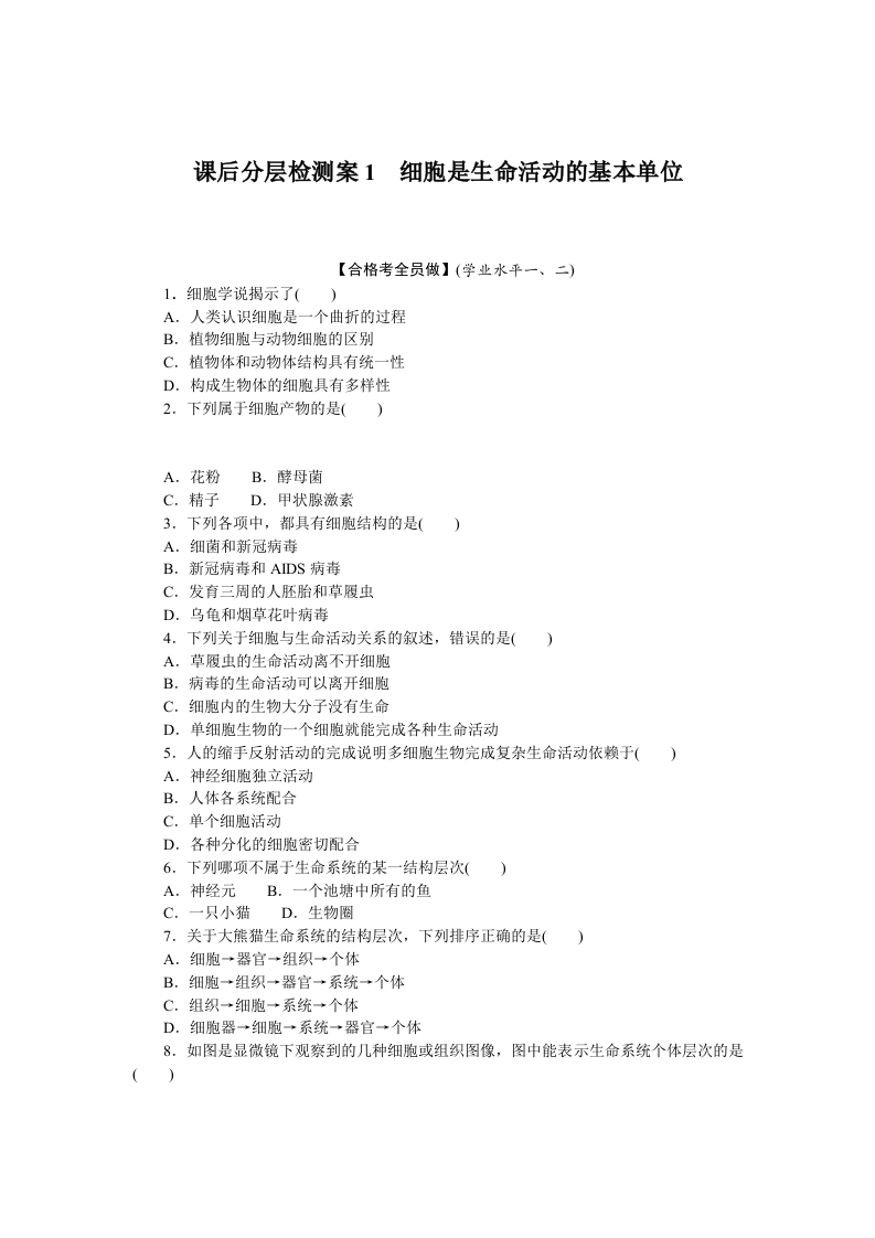 2025年高中生物必修1课后分层检测案1