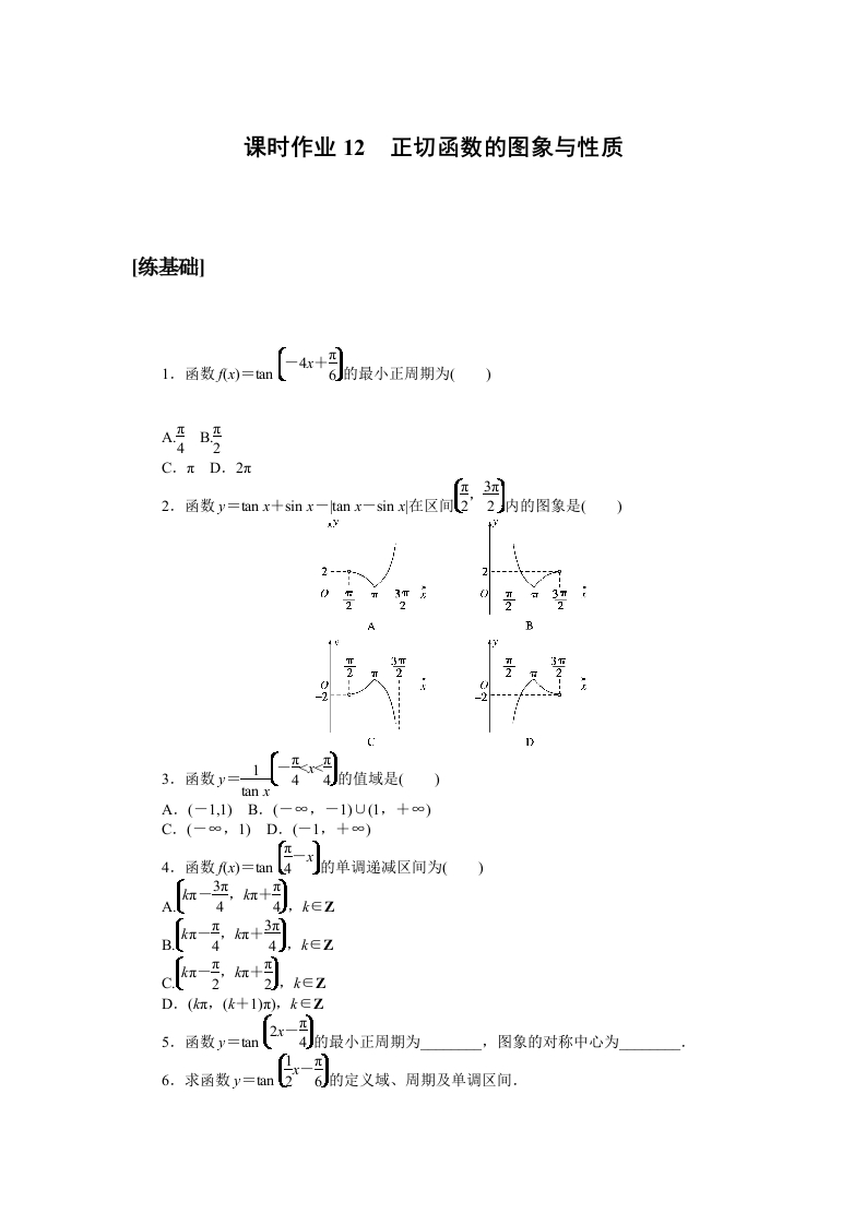 学生啦:课时作业12正切函数的图象与性质1.函数fx)=an6J的最小正周期为(C.πD.2π3.函数y=1tan xA.(-1,1)B.C.(-,1)D.(-1,+∞)的单调递减区间为444,k∈Z4的最小正周期为图象的对称中心为