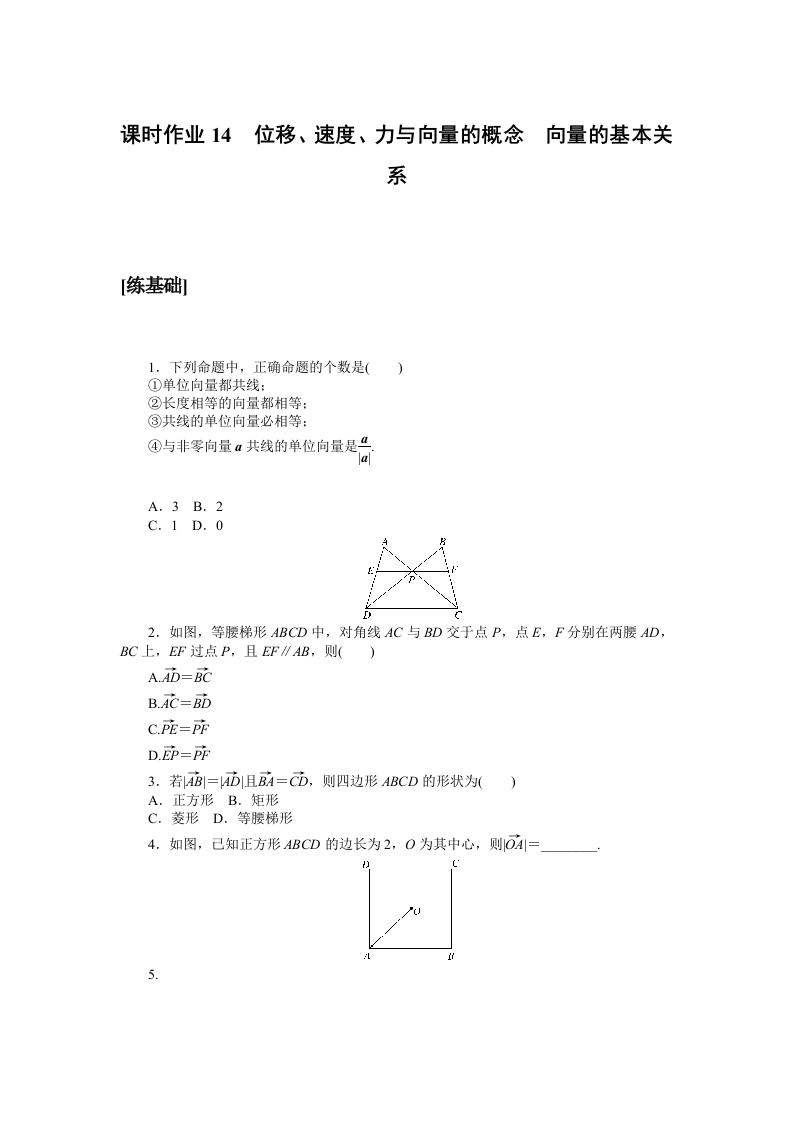学生啦:课时作业14位移、速度、力与向量的概念向量的基本关系练基础1.下列命题中,正确命题的个数是()①单位向量都共线:②长度相等的向量都相等:③共线的单位向量必相等:④与非零向量“共线的单位向量是“A.3B.2C.1D.02.如图,等腰梯形ABCD中,对角线AC与BD交于点P,点E,F分别在两腰AD,BC上,EF过点P,且EF∥AB,则()A.AD=BCB.AC=BD3.若AB=AD且BA=CD,则四边形ABCD的形状为()A.正方形B.矩形C.菱形D.等腰梯形4.如图,己知正方形ABCD的边长为2,O为其中心,则OA=5.