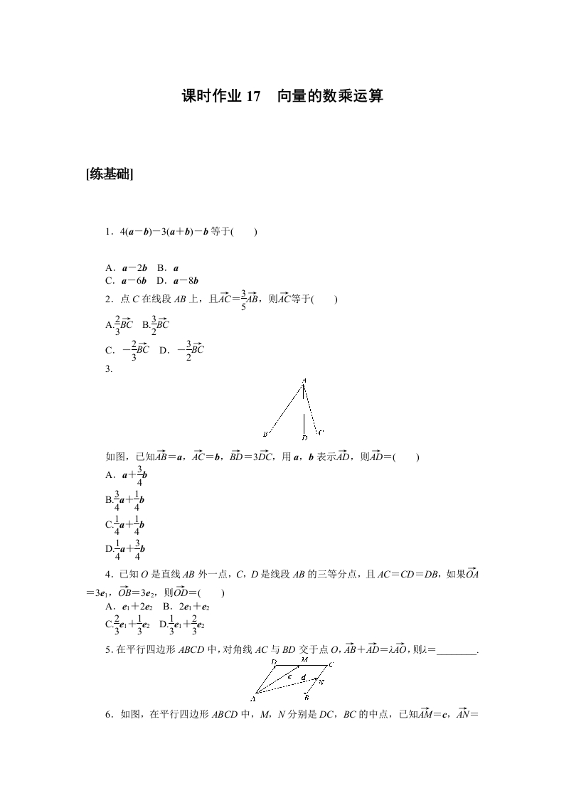 学生啦:课时作业17向量的数乘运算1.4(a-b)-3(a+b)-b等于()A.a-2b B.aC.a-6b D.a-8bC.-2BC D.-3Bc323.如图,己知AB=a,AC=b,BD=3DC,用a,b表示AD,则AD=()A.a+3444.已知O是直线AB外一点,C,D是线段AB的三等分点,且AC=CD=DB,如果OA5.在平行四边形ABCD中,对角线AC与BD交于点O,AB十AD=元AO,则元=6.如图,在平行四边形ABCD中,M,N分别是DC,BC的中点,己知AM=C,AN=