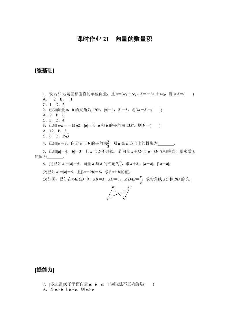 学生啦:课时作业21向量的数量积1.设e1和e2是互相垂直的单位向量,且a=3e1+2e2,b=-3e十4e2,则ab=()A.-2B.-1C.1D.2A.7B.6C.5D.43.己知ab=一122,1@=4,a和b的夹角为135°,则1b=()A.12B.34.已知@=3,向量a与b的夹角为9则a在b方向上的投影为5.己知a=4,l=3,且a与b不共线.若向量a十b与a一b互相垂直,则实数k的值为6.()已知a==5,向量a与b的夹角为9求a+b,a一,Ba+b提能力7.[多选题]关于平面向量a,b,c,下列说法不正确的是()A.若a∥b且b∥c,则a∥e