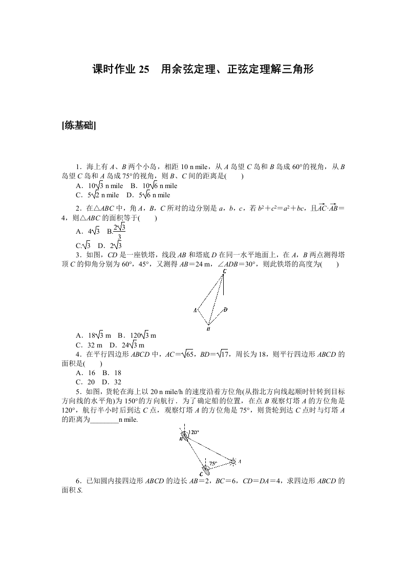 学生啦:课时作业25用余弦定理、正弦定理解三角形练基础1.海上有A、B两个小岛,相距10 n mile,从A岛望C岛和B岛成60°的视角,从B岛望C岛和A岛成75的视角,则B、C间的距离是()2.在△ABC中,角A,B,C所对的边分别是a,b,c,若b2+c2=a2+bC,且ACAB=4,则△ABC的面积等于()A.45B233C.5D.253.如图,CD是一座铁塔,线段AB和塔底D在同一水平地面上,在A,B两点测得塔顶C的仰角分别为60°,45°,又测得AB=24m,∠ADB=30°,则此铁塔的高度为()A.18V3mB.120W3m4.在平行四边形ABCD中,AC=65,BD=17,周长为18,则平行四边形ABCD的面积是()A.16B.18C.20D.325.如图,货轮在海上以20 n mile/h的速度沿着方位角(从指北方向线起顺时针转到目标方向线的水平角)为150°的方向航行,为了确定船的位置,在点B观察灯塔A的方位角是120°,航行半小时后到达C点,观察灯塔A的方位角是75°,则货轮到达C点时与灯塔A的距离为n mile.20751C6.己知圆内接四边形ABCD的边长AB=2,BC=6,CD=DA=4,求四边形ABCD的面积S