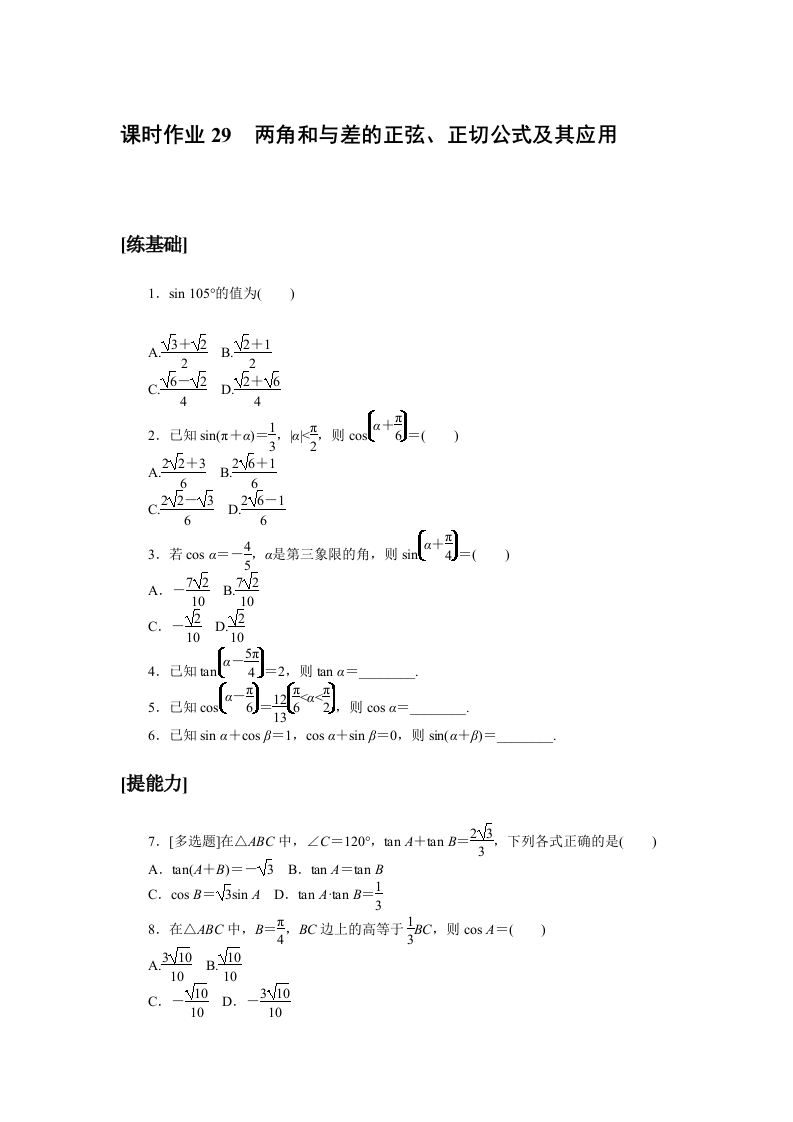 学生啦:课时作业29两角和与差的正弦、正切公式及其应用1.sin105的值为(22D2+644A25+3B26+16666A.1010C.1054.己知an4=2,则ana=则cosa=己知sina+cosB=l,cosa+sinB=0,则sin(a+=提能力下列各式正确的是()3A.tan(+B)=3 B.tan 4=tan B38.在△ABC中,B=二,BC边上的高等于BC,则cOsA=()410101010