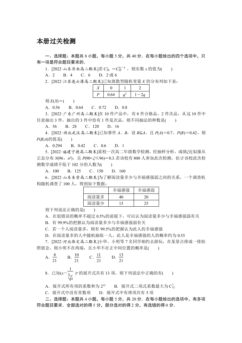 首页高中数学高三人教A版数学选择性必修第三册本册过关检测