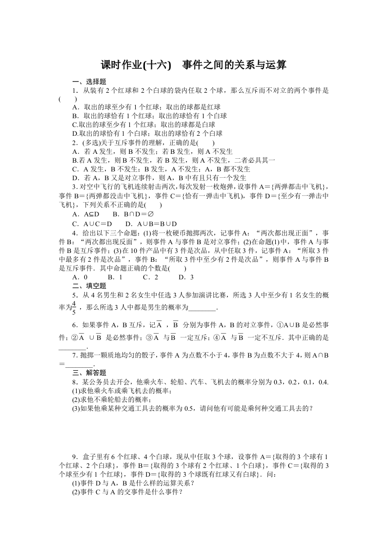 学生啦:课时作业十六)事件之间的关系与运算一、选择题1.从装有2个红球和2个白球的袋内任取2个球,那么互斥而不对立的两个事件是A.取出的球至少有1个红球:取出的球都是红球B.取出的球恰有1个红球:取出的球恰有1个白球C取出的球至少有1个红球:取出的球都是白球D.取出的球恰有1个白球:取出的球恰有2个白球2.(多选)关于互斥事件的理解,正确的是()A.若A发生,则B不发生:若B发生,则A不发生B.若A发生,则B不发生,若B发生,则A不发生,二者必具其一C.A发生,B不发生:B发生,A不发生:A,B都不发生D.若A,B又是对立事件,则A,B中有且只有一个发生3.对空中飞行的飞机连续射击两次,每次发射一枚炮弹,设事件A={两弹都击中飞机},事件B={两弹都没击中飞机},事件C={恰有一弹击中飞机),事件D={至少有一弹击中飞机},下列关系不正确的是()C.AUC=DD.AUB=BUD4.给出以下三个命题:(1)将一枚硬币抛掷两次,记事件A:“两次都出现正面”,事件B:“两次都出现反面”,则事件A与事件B是对立事件:(2)在命题(1)中,事件A与事件B是互斥事件:(3)在10件产品中有3件是次品,从中任取3件,记事件A:“所取3件中最多有2件是次品”,事件B:“所取3件中至少有2件是次品”,则事件A与事件B是互斥事件.其中命题正确的个数是(A.0B.1C.2D.3二、填空题5.从4名男生和2名女生中任选3人参加演讲比赛,所选3人中至少有1名女生的概率为,那么所选3人中都是男生的概率为6.如果事件A,B互斥,记A,B分别为事件A,B的对立事件,①AUB是必然事件:②AUB是必然事件:③A与B一定互斥:④A与B一定不互斥,其中正确的是7.抛掷一颗质地均匀的骰子,事件A为点数不小于4,事件B为点数不大于4,则A∩B三、解答题8.某公务员去开会,他乘火车、轮船、汽车、飞机去的概率分别为03,02,0.1,0.4.(1)求他乘火车或乘飞机去的概率:(②)求他不乘轮船去的概率:(3)如果他乘某种交通工具去的概率为0.5,请问他有可能是乘何种交通工具去的?9.盒子里有6个红球、4个白球,现从中任取3个球,设事件A={取得的3个球有1个红球、2个白球},事件B={取得的3个球有2个红球、1个白球},事件C={取得的3个球至少有1个红球},事件D=取得的3个球既有红球又有白球},问:(I)事件D与A,B是什么样的运算关系?(2)事件C与A的交事件是什么事件?