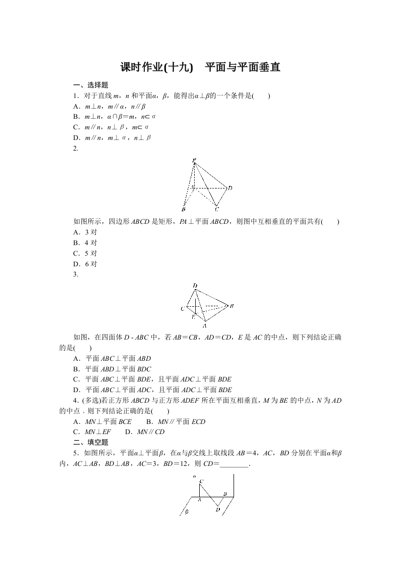 学生啦:课时作业(十九)平面与平面垂直一、选择题1.对于直线m,n和平面a,B,能得出a⊥的一个条件是()2.如图所示,四边形ABCD是矩形,A⊥平面ABCD,则图中互相垂直的平面共有()A.3对B.4对C.5对D.6对3.如图,在四面体D-ABC中,若AB=CB,AD=CD,E是AC的中点,则下列结论正确的是()A.平面ABC⊥平面ABDB.平面ABD⊥平面BDCC.平面ABC⊥平面BDE,且平面ADC⊥平面BDED.平面ABC⊥平面ADC,且平面ADC⊥平面BDE4.(多选)若正方形ABCD与正方形ADEF所在平面互相垂直,M为BE的中点,N为AD的中点,则下列结论正确的是()A.MN⊥平面BCEB.MN∥平面ECD二、填空题5.如图所示,平面a⊥平面B,在a与B交线上取线段AB=4,AC,BD分别在平面a和B内,AC⊥AB,BD⊥AB,AC=3,BD=12,则CD=