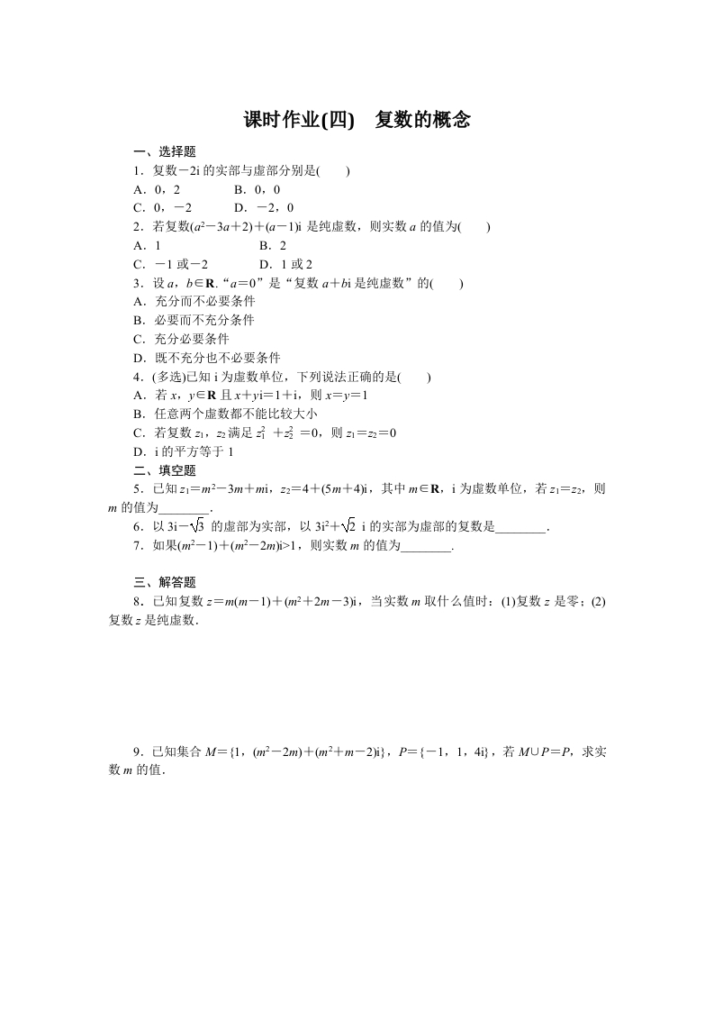 学生啦:课时作业(四)复数的概念一、选择题1.复数一2i的实部与虚部分别是()A.0,2B.0,0C.0,-2D.-2,02.若复数(a2-3a+2)十(a一1)i是纯虚数,则实数a的值为()A.1B.2C.-1或-2D.1或23.设a,b∈R.“a=0”是“复数a十bi是纯虚数”的()A.充分而不必要条件B.必要而不充分条件C.充分必要条件D.既不充分也不必要条件4.(多选)己知i为虚数单位,下列说法正确的是()A.若x,y∈R且x十yi=1+i,则x=y=1B.任意两个虚数都不能比较大小D.i的平方等于1二、填空题5.己知z1=m2-3m十mi,z2=4+(5m十4)i,其中m∈R,i为虚数单位,若z1=z2,则m的值为6.以3i一3的虚部为实部,以32+迈i的实部为虚部的复数是7.如果(m2-1)十(m2-2m)i>1,则实数m的值为三、解答题8.己知复数z=m(m一1)+(m2+2m一3)i,当实数m取什么值时:(1)复数z是零:(2)复数z是纯虚数.9.己知集合M={1,(m2-2m)+(0m2+m-2)i},P={-1,1,4i,若MUP=P,求实数m的值.