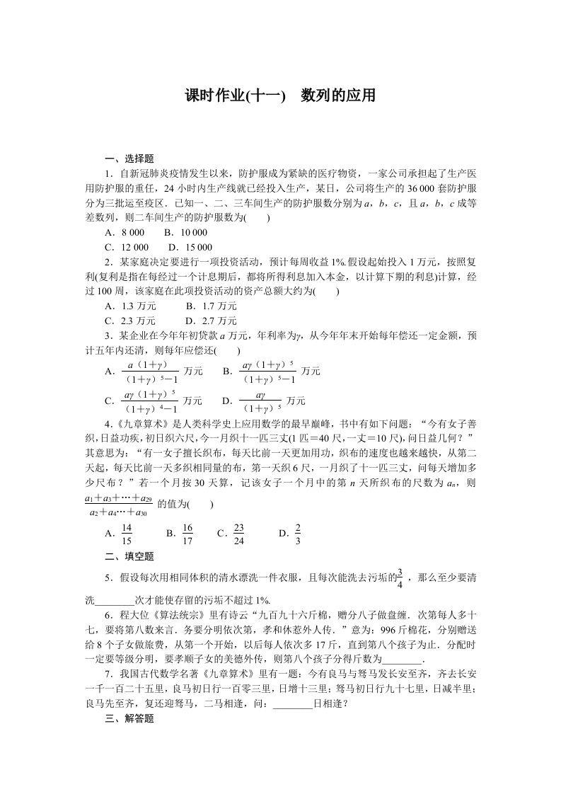 学生啦:课时作业(十一)数列的应用一、选择题1.自新冠肺炎疫情发生以来,防护服成为紧缺的医疗物资,一家公司承担起了生产医用防护服的重任,24小时内生产线就己经投入生产,某日,公司将生产的36000套防护服分为三批运至疫区.己知一、二、三车间生产的防护服数分别为a,b,c,且a,b,c成等差数列,则二车间生产的防护服数为(A.8000B.10000C.12000D.150002.某家庭决定要进行一项投资活动,预计每周收益1%.假设起始投入1万元,按照复利(复利是指在每经过一个计息期后,都将所得利息加入本金,以计算下期的利息)计算,经过100周,该家庭在此项投资活动的资产总额大约为()A.13万元B.1.7万元C.2.3万元D.2.7万元3.某企业在今年年初贷款a万元,年利率为,从今年年末开始每年偿还一定金额,预计五年内还清,则每年应偿还()万元(1+y)5-1(1+y)5-14.《九章算术》是人类科学史上应用数学的最早巅峰,书中有如下问题:“今有女子善织,日益功疾,初日织六尺,今一月织十一匹三丈(1匹=40尺,一丈=10尺),问日益几何?”其意思为:“有一女子擅长织布,每天比前一天更加用功,织布的速度也越来越快,从第二天起,每天比前一天多织相同量的布,第一天织6尺,一月织了十一匹三丈,问每天增加多少尺布?”若一个月按30天算,记该女子一个月中的第n天所织布的尺数为a,则A.41517D.24二、填空题5.假设每次用相同体积的清水漂洗一件衣服,且每次能洗去污垢的,那么至少要清洗次才能使存留的污垢不超过1%6.程大位《算法统宗》里有诗云“九百九十六斤棉,赠分八子做盘缠。次第每人多十七,要将第八数来言.务要分明依次第,孝和休惹外人传.”意为:996斤棉花,分别赠送给8个子女做旅费,从第一个开始,以后每人依次多17斤,直到第八个孩子为止.分配时一定要等级分明,要孝顺子女的美德外传,则第八个孩子分得斤数为7.我国古代数学名著《九章算术》里有一题:今有良马与驽马发长安至齐,齐去长安一千一百二十五里,良马初日行一百零三里,日增十三里:驽马初日行九十七里,日减半里:良马先至齐,复还迎驽马,二马相逢,问:日相逢?三、解答题