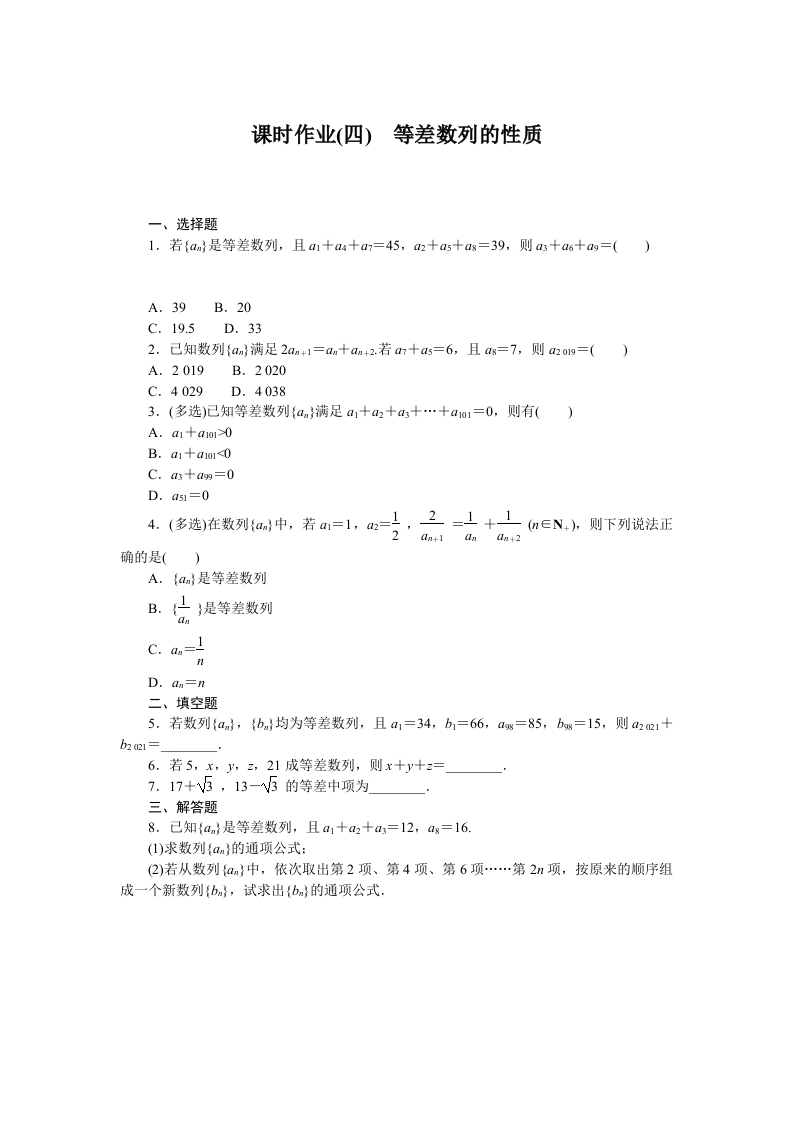 学生啦:课时作业(四)等差数列的性质一、选择题A.39B.20C.19.5D.33A.2019B.2020C.4029D.40383.(多选)已知等差数列{an}满足a1十a2十a3十…十a1o1=0,则有()D.a51=0确的是()A.{an}是等差数列D.an=n二、填空题5.若数列{an},{bn}均为等差数列,且a=34,b1=66,ag=85,bg=15,则a2m1十b221=6.若5,x,y,2,21成等差数列,则x十y十z=7.17+3,13-3的等差中项为三、解答题8.已知{an}是等差数列,且a十a2十=12,ag=16.(1)求数列{an}的通项公式:(2)若从数列{am}中,依次取出第2项、第4项、第6项…第2n项,按原来的顺序组成一个新数列{bn},试求出{b}的通项公式.