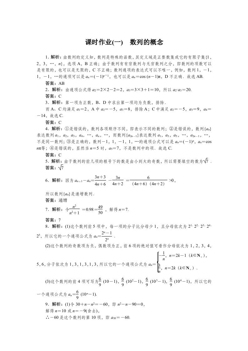 学生啦:课时作业(一)数列的概念1.解析:由数列的定义知,数列是特殊的函数,其定义域是正整数集或它的有限子集{1,2,3,…,},选项A,B正确;由于数列有有穷数列与无穷数列之分,即数列的项数可以是有限的,也可以是无限的,C不正确;数列通项的表达式可以不唯一,例如,数列1,一1,答案:AB2.解析:由通项公式得a2=2×2-2=2,a3=3×3+1=10,所以a2=20.答案:C3.解析:第一项为正数,B、D中求出第一项均为负数,排除,而A、C均满足a=2,A中a2=一5,a3=8,排除A;C中满足a2=-5,a3=9,a4=-14,故选C答案:C4.解析:①是错误的,数列各项顺序不同,即表示不同的数列;②是错误的,数列{}nπ等;④是错误的,显然当n=5时,a5=7,不是数列中的项.故选C答案:C5,解析:由于数列的前几项的根号下的数是由小到大的奇数,所以需要填空的数为7.3n+33n64n+64n+2(4n+6)(4n+2)所以数列{an}是递增数列.答案:递增=0.98=答案:78.解析:(1)这个数列前5项中,每一项的分子比分母少1,且分母依次为2122,23,24,(2)这个数列的奇数项为负,偶数项为正,前6项的绝对值可看作分母依次为1,2,3,4,n=2k-1(k∈N),n5,6,分子依次为1,3,1,3,1,3,所以它的一个通项公式为am=09.解析:(1)令30+n-m2=-60,即n2-n-90=0,解得n=10或n=-9(舍去),一60是这个数列的第10项,即a10=一60.