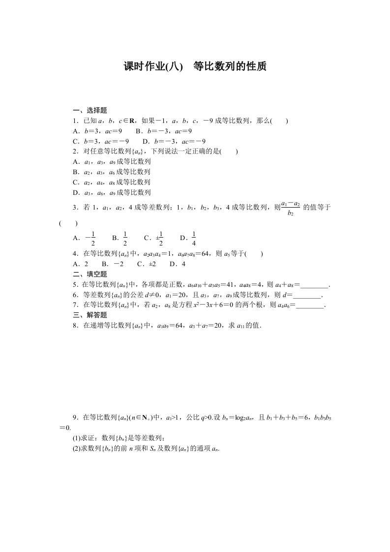 学生啦:课时作业(八)等比数列的性质一、选择题1.己知a,b,c∈R,如果一l,a,b,c,-9成等比数列,那么()A.b=3,ac=9B.b=-3,ac=9C.b=3,ac=-9D.b=-3,ac=-92.对任意等比数列{a},下列说法一定正确的是()B.a2,a3,a6成等比数列C.a2,a4,as成等比数列D.,a6,四成等比数列3.若1,1,a2,4成等差数列:1,b,2,bs,4成等比数列,则-@的值等于()C.4A.2B.-2C.2D.4二、填空题5.在等比数列{an}中,各项都是正数,a6a10十a3as=41,a4ag=4,则a4十ag=6.等差数列{a}的公差d≠0,a1=20,且as,a,a四成等比数列,则d=一·7.在等比数列{an}中,若a2,as是方程x2-3x十6=0的两个根,则a4a6=三、解答题8.在递增等比数列{an}中,a1ag=64,a3十a=20,求a1的值.=0.(1)求证:数列{b}是等差数列:(2)求数列{bu}的前n项和Sn及数列{am}的通项an.