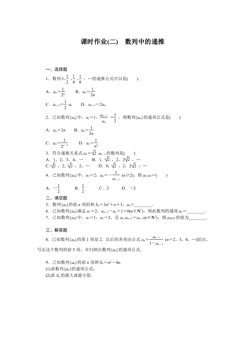 学生啦:课时作业(二)数列中的递推一、选择题2nan22n1D.an=n23.符合递推关系式an=V2an-1的数列是()A.1,2,3,4,…B.1,2,2,22,…an-1B.C.2D.-2二、填空题5.数列{an}的前n项的和Sn=32+n+1,an=三、解答题写出这个数列的前5项,并归纳出数列{a}的通项公式.9.己知数列{an}的前n项和Sn=n2一4n.(1)求数列{an}的通项公式:(2)求Sm的最大或最小值.