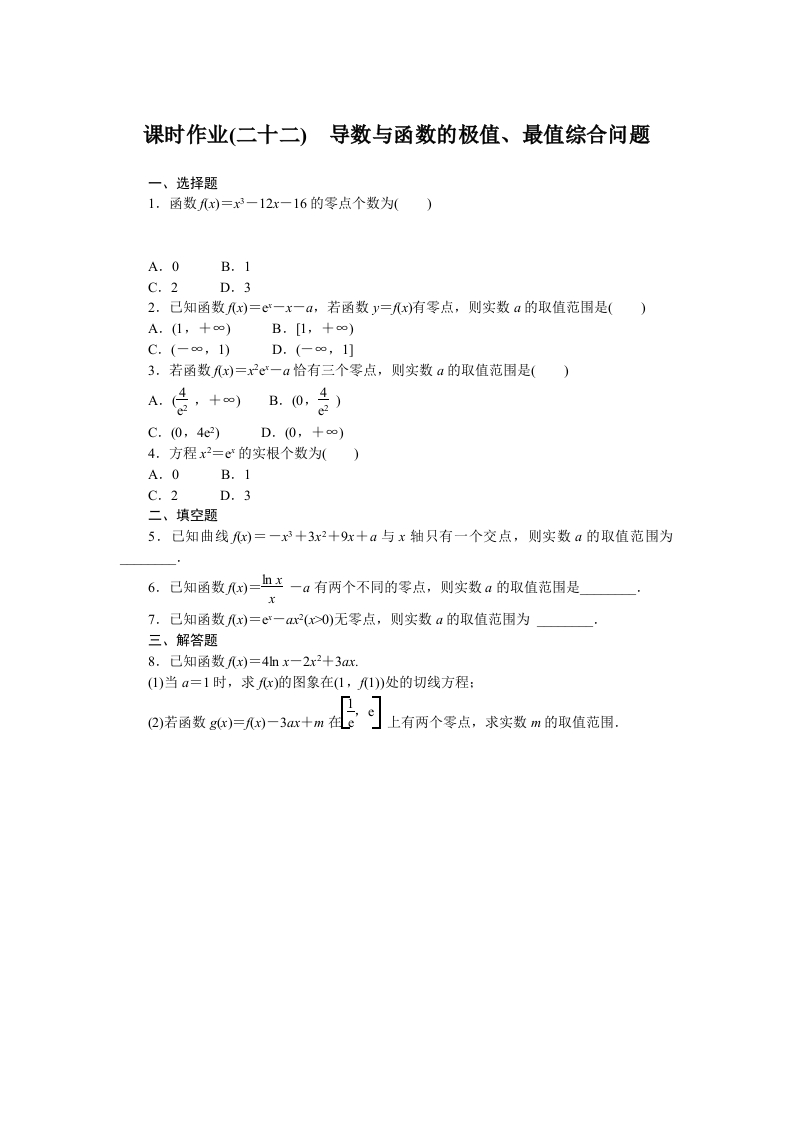 学生啦:课时作业(二十二)导数与函数的极值、最值综合问题一、选择题1.函数x)=x3-12x-16的零点个数为)A.0B.1C.2D.32.己知函数x)=e一x一a,若函数y=fx)有零点,则实数a的取值范围是()3.若函数fx)=x2e一a恰有三个零点,则实数a的取值范围是()C.(0,4e2)4.方程x2=e的实根个数为)A.0B.1C.2D.3二、填空题5.己知曲线w)=一x3+3x2+9x+a与x轴只有一个交点,则实数a的取值范围为6.己知函数y=血上一a有两个不同的零点,则实数a的取值范围是7.己知函数fx)=e一r(0)无零点,则实数a的取值范围为三、解答题(1)当a=1时,求x)的图象在(1,1)处的切线方程:,©上有两个零点,求实数m的取值范围,