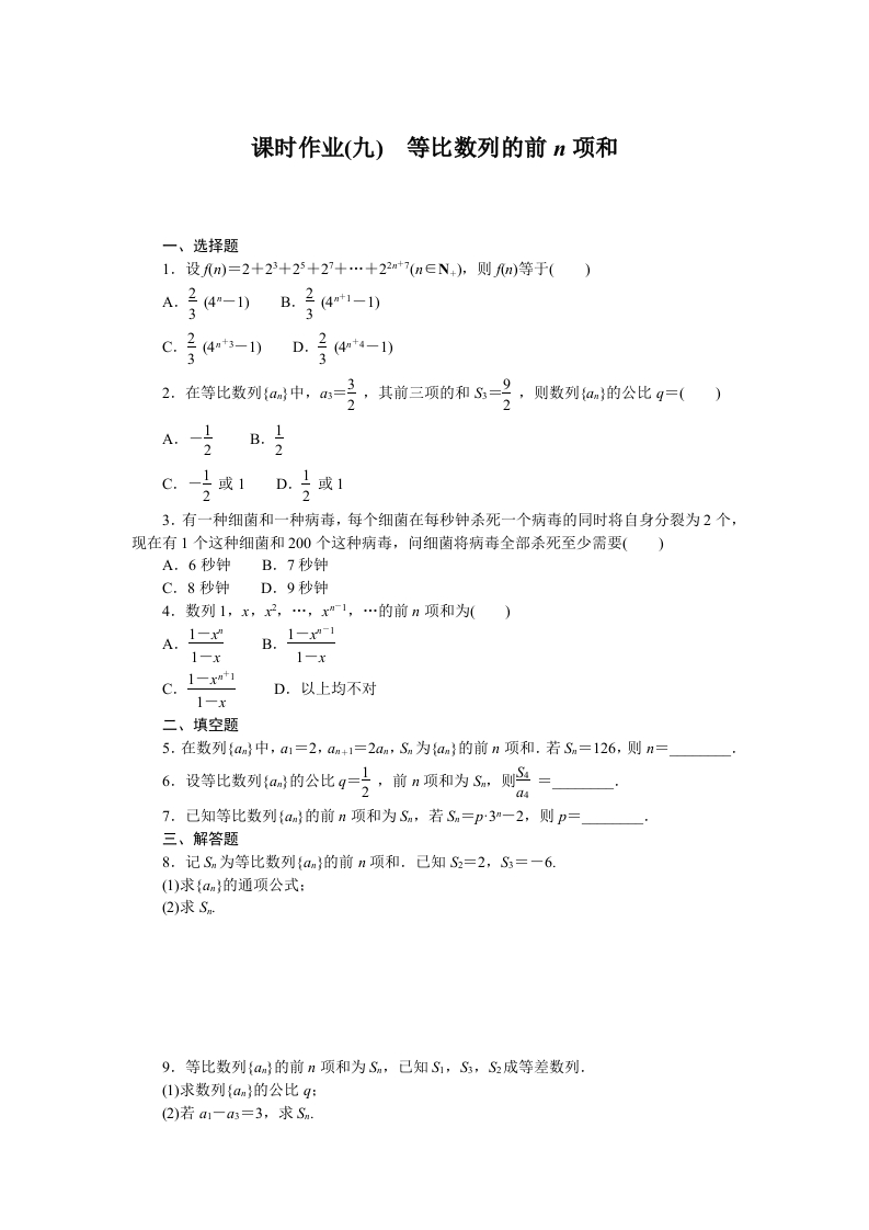 学生啦:课时作业(九)等比数列的前n项和一、选择题3223.有一种细菌和一种病毒,每个细菌在每秒钟杀死一个病毒的同时将自身分裂为2个,现在有1个这种细菌和200个这种病毒,问细菌将病毒全部杀死至少需要()A.6秒钟B.7秒钟C.8秒钟D.9秒钟B.1C.L-xD.以上均不对二、填空题5.在数列{an}中,a1=2,an+1=2an,Sn为{an}的前n项和.若Sn=126,则n=7.己知等比数列{an}的前n项和为Sn,若Sn=p3”-2,则p=三、解答题8.记Sn为等比数列{an}的前n项和.己知S2=2,S=一6.(1)求{an}的通项公式:(2)求Sn9.等比数列{an}的前n项和为Sn,己知S,S,S2成等差数列.(1)求数列{an}的公比q: