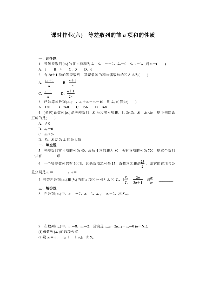 学生啦:课时作业(六)等差数列的前n项和的性质1.设等差数列{a}的前n项和为Sn,Sm-1=一2,Sm=0,Sm+1=3,则m=()A.3B.4C.5D.62.含2n十1项的等差数列,其奇数项的和与偶数项的和之比为()D.+1n2n3.己知等差数列{an}中,a5十ag一a=10,则Ss的值为()A.130B.260C.156D.1684.(多选)设数列{an}是等差数列,Sn为其前n项和,且SSa,则下列结论正确的是()D.Ss、Sg均为Sn的最大值二、填空题5.等差数列前4项的和为40,最后4项的和为80,所有各项的和为720,则这个数列一共有项6。一个等差数列共有10项,其偶数项之和是15,奇数项之和是三,则它的首项与公差分别是a1=,d=7.若等差数列{a和{b的前n项和分别为Sn和T,且bs三、解答题(I)求数列{an}的通项公式: