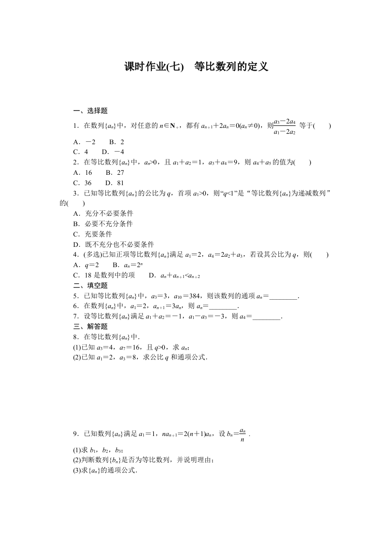 学生啦:课时作业(七)等比数列的定义一、选择题a1-2a2A.-2B.2C.4D.-4A.16B.27C.36D.813.己知等比数列{an}的公比为g,首项a0,则“g<1”是“等比数列{an}为递减数列”A.充分不必要条件B.必要不充分条件C.充要条件D.既不充分也不必要条件4.(多选)已知正项等比数列{an}满足a1=2,a4=2a2十a3,若设其公比为g,则()A.q=2 B.an=2m二、填空题7.设等比数列{a}满足a十a2=一1,a1一a3=一3,则a4=三、解答题8.在等比数列{an}中.(1)己知a3=4,=16,且g0,求am:(2)己知a1=2,3=8,求公比g和通项公式.(1)求b1,b2,b:(2)判断数列{b}是否为等比数列,并说明理由:(3)求{an}的通项公式.