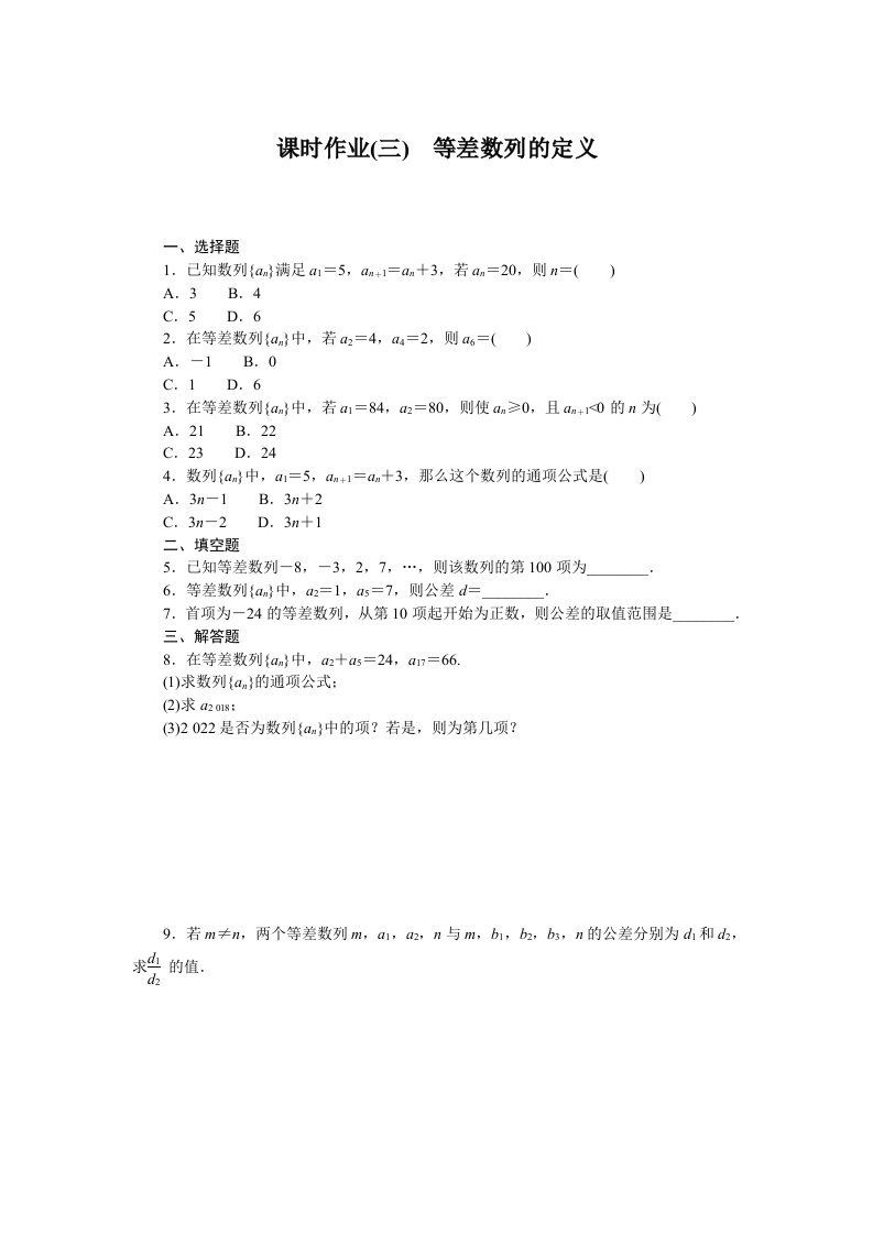 学生啦:课时作业(三)等差数列的定义1.己知数列{an}满足a=5,am+1=an十3,若an=20,则n=()A.3B.4C.5D.62.在等差数列{an}中,若a2=4,au=2,则a6=()A.-1B.0C.1D.63.在等差数列{an}中,若a=84,a2=80,则使an≥0,且am+1<0的n为()A.21B.22C.23D.244.数列{an}中,a1=5,am+1=an十3,那么这个数列的通项公式是()A.3n-1B.3n+2C.3n-2D.3n+1二、填空题5.己知等差数列一8,一3,2,7,…,则该数列的第100项为6.等差数列{an}中,a2=1,s=7,则公差d=7.首项为一24的等差数列,从第10项起开始为正数,则公差的取值范围是三、解答题8.在等差数列{an}中,a2十as=24,a17=66.(1)求数列{an}的通项公式:(3)2022是否为数列{an}中的项?若是,则为第几项?9.若m≠n,两个等差数列,a,a2,n与m,b1,b2,bs,n的公差分别为d山和d,d