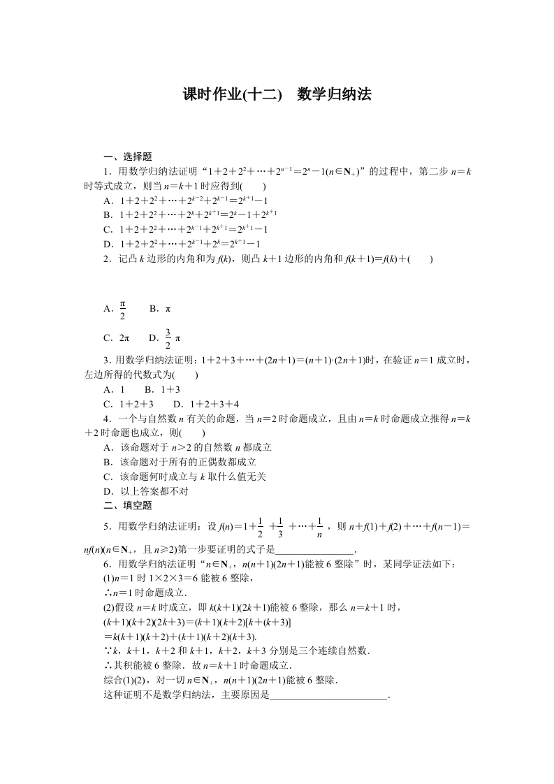 学生啦:课时作业(十二)数学归纳法一、选择题1.用数学归纳法证明“1十2十22+…+2”-1=2”-1(n∈N+)”的过程中,第二步n=k时等式成立,则当n=k+1时应得到()A.1+2+22+…+2-2+2-1=2k+1-1C.1+2+22+…+21+2+1=2+1-12.记凸k边形的内角和为),则凸k+1边形的内角和张+1)=)十()B.2左边所得的代数式为()A.1B.1+3C.1+2+3D.1+2+3+44.一个与自然数n有关的命题,当=2时命题成立,且由n=k时命题成立推得n=k十2时命题也成立,则()A.该命题对于n>2的自然数n都成立B.该命题对于所有的正偶数都成立C.该命题何时成立与k取什么值无关D.以上答案都不对二、填空题23nn)(n∈N+,且n≥2)第一步要证明的式子是6.用数学归纳法证明“n∈N+,n(n十1)(2n+1)能被6整除”时,某同学证法如下:(1)n=1时1×2×3=6能被6整除,∴n=1时命题成立.(2)假设n=k时成立,即k(k十1)(2k+1)能被6整除,那么n=k+1时,,k,k+1,k+2和k十1,k+2,k+3分别是三个连续自然数.综合(1)2),对一切n∈N+,(n+1)(2n十1)能被6整除.这种证明不是数学归纳法,主要原因是