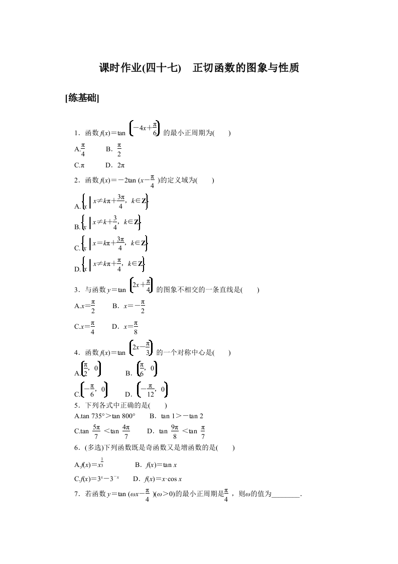 学生啦:课时作业(四十七正切函数的图象与性质的最小正周期为()D.2元43.与函数y=an+的图象不相交的一条直线是()A=C.x=D.x=I4.函数fx)=an的一个对称中心是()в。5.下列各式中正确的是()A.tan 735>tan 800 B.tan 1>-tan 2876.(多选)下列函数既是奇函数又是增函数的是()4