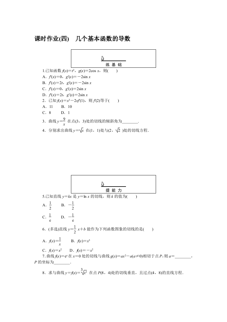 学生啦:课时作业(四)几个基本函数的导数练基础1.已知函数fx)=P,gx)=2cosx,则()A.f(x)=0,g'(x)=-2sin xB.f(x)=2t,g'(x)=-2sin xC.f(x)=0,g'(x)=2sin xD.f(x)=2t,g'(x)=2sin x2.己知fx)=x3-2xy1),则f2)等于()A.11B.10C.8D.13.曲线y=9在点6,3)处的切线的倾斜角为4.分别求出曲线y=在(1,1)处与2,2)处的切线方程.提能力5.己知直线y=c是y=nx的切线,则k的值为(AB.ee6。(多选直线)x+6能作为下列函数图象的切线的是(7.曲线)=e在x=0处的切线与曲线g(x)=ar2-a(a≠0)相切于点P,则a=P的坐标为8.求与曲线y==F在点P8,4)处的切线垂直,且过点4,8)的直线方程.