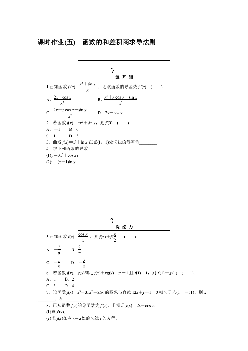 学生啦:课时作业(五)函数的和差积商求导法则练基础1.已知函数f=+smxA.2x+cosxB.x cosx-sin xx22C.D.2x-cosxx2A.-1B.0C.1D.33.曲线x)=x3+nx在点(1,1)处切线的斜率为4.求下列函数的导数:(1)y=3x2+cosx:提能力B.2D.-3A.1B.2C.3D.47.设函数fx)=x3-3a2+3br的图象与直线12x+y-1=0相切于点(1,一11),则a=8.己知函数fx)的导函数为f(x),且满足x)=2x十cosx.(1)求fx):(2)求x)在点x=π处的切线1的方程.