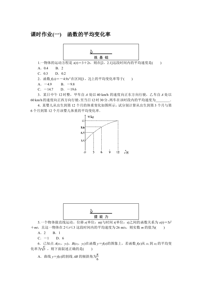 学生啦:课时作业(一)函数的平均变化率练基础1.一物体的运动方程是s()=3+21,则在[2,2.1]这段时间内的平均速度是()A.0.4B.2C.03D.022.函数x)=一4.9x2在区间[1,2]上的平均变化率等于()A.-4.9B.-9.8C.-14.7D.-19.63.某日中午12时整,甲车自A处以40kmh的速度向正东方向行驶,乙车自A处以60kmh的速度向正西方向行驶,至当日12时30分,两车在该时段内的平均速度为4.某婴儿从出生到第12个月的体重变化如图所示,试分别计算从出生到第3个月与第6个月到第12个月该婴儿体重的平均变化率.6提能力5.一个物体做直线运动,位移s(单位:m)与时间(单位:s)之间的函数关系为s)=5+mt,且这一物体在2≤1≤3这段时间内的平均速度为26ms,则实数m的值为()A.2B.1C.-1D.66.己知点A(,),Bx2,)在函数y=f)的图象上,若函数x)从x到2的平均变化率为V3,则下面叙述正确的是()A.曲线y=x)的割线AB的倾斜角为严