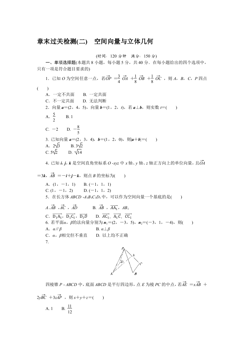 学生啦:章末过关检测(二)空间向量与立体几何(时间:120分钟满分:150分)一、单项选择题(本题共8小题,每小题5分,共40分,在每小题给出的四个选项中,只有一项是符合题目要求的)()A.一定不共面B.一定共面C.不一定共面D.无法判断2.向量a=(2,4,5),向量b=(1,2,),若a⊥b,则实数=()A.B.12C.-2D3.己知向量a=(2,3,4),b=(1,2,0),则a十b1=()A.23C.55D.V144.己知i,j,k是空间直角坐标系Oz中x轴、y轴、z轴正方向上的单位向量,且OA=3k,AB=一i+-k,则点B的坐标为(A.(1,-1,1)B.(-1,1,1)C.(1,-1,2)D.(-1,1,2)5.在长方体ABCD-A B1CD1中,可以作为空间向量一个基底的是()A.AB ,AC,ADB.AB,AA,AB6.若平面a,的法向量分别为n1=(2,一3,5),n2=(-3,1,一4),则()A.a∥BC.a,B相交但不垂直D.以上均不正确四棱锥P,ABCD中,底面ABCD是平行四边形,点E为棱PC的中点,若AE=xAB十12
