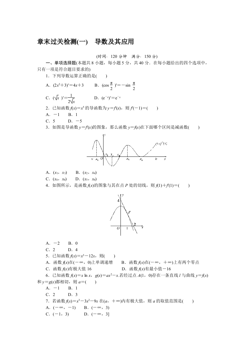 学生啦:章末过关检测(一)导数及其应用(时间:120分钟满分:150分)一、单项选择题(本题共8小题,每小题5分,共40分.在每小题给出的四个选项中,只有一项是符合题目要求的)1.下列导数运算正确的是()A.(2x2+3)'=4x+32D.(e *)'=e22.己知函数x)=x的导函数为y=x),则f(一1)=()A.-1B.1C.5D.-53.如图是导函数y=fx)的图象,那么函数y=x)在下面哪个区间是减函数()i4.如图所示,是函数x)的图象与其在点P处的切线,则1)十(1)=()A.-2B.0C.2D.45.己知函数x)=x3一12x,则()C.函数x)有极大值16D.函数x)有最小值一166.己知函数儿x)=x血x,gc)=x2-x若经过点A(1,0)存在一条直线1与曲线y=x)和y=gx)都相切,则a=()A.-1B.1C.2D.37.若函数x)=x3一3x2-9x在(a,十o)内有极大值,则a的取值范围是()A.(-∞,-1)B.(-∞,3)C.(-1,3)