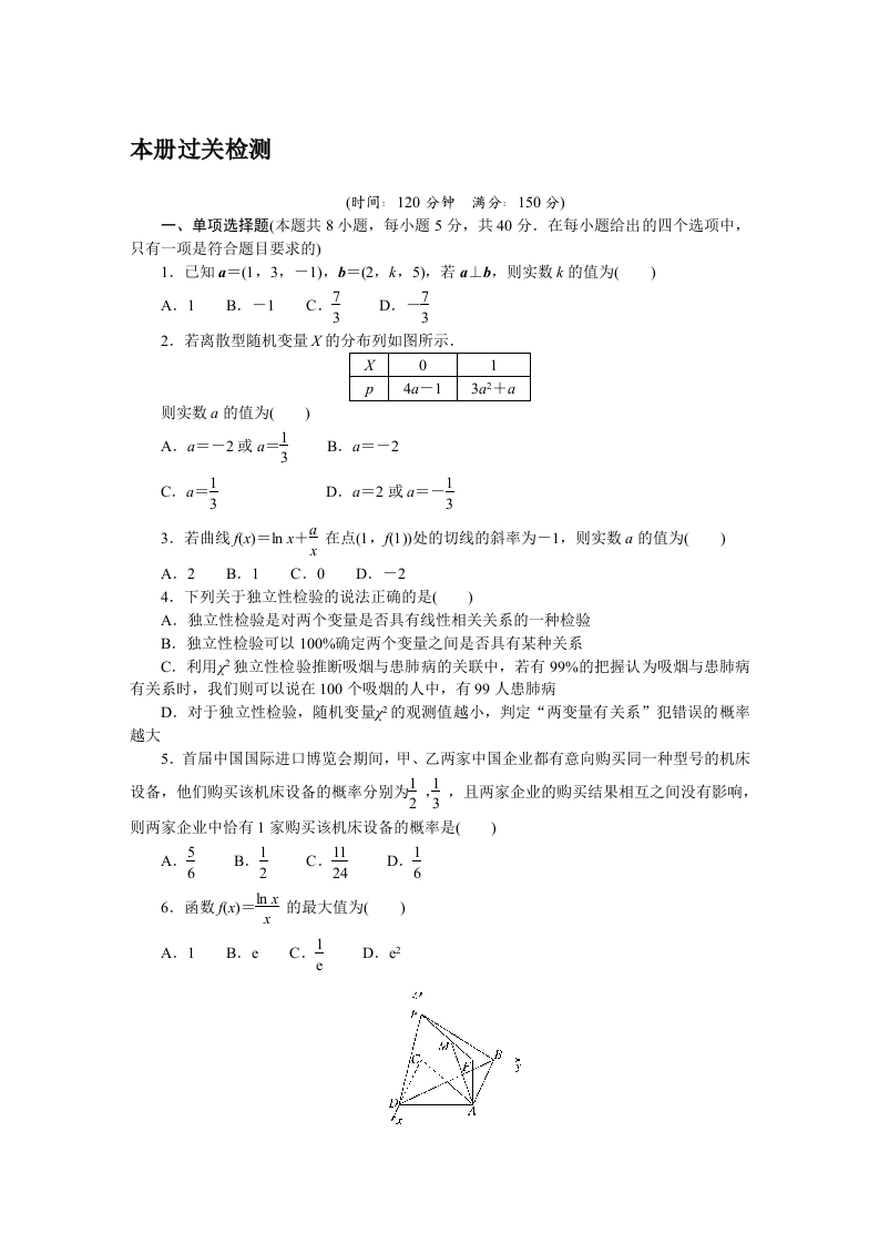 学生啦:本册过关检测(时间:120分钟满分:150分)一、单项选择题(本题共8小题,每小题5分,共40分.在每小题给出的四个选项中,只有一项是符合题目要求的)1.己知a=(1,3,一1),b=(2,k,5),若a⊥b,则实数k的值为()A.1B.-1D.-332.若离散型随机变量X的分布列如图所示,014a-13a2+a则实数a的值为(B.a=-2D.a=2或a=-3A.2B.1C.0D.-24.下列关于独立性检验的说法正确的是(A.独立性检验是对两个变量是否具有线性相关关系的一种检验B.独立性检验可以100%确定两个变量之间是否具有某种关系C.利用?独立性检验推断吸烟与患肺病的关联中,若有99%的把握认为吸烟与患肺病有关系时,我们则可以说在100个吸烟的人中,有99人患肺病D.对于独立性检验,随机变量的观测值越小,判定“两变量有关系”犯错误的概率越大5.首届中国国际进口博览会期间,甲、乙两家中国企业都有意向购买同一种型号的机床设备,他们购买该机床设备的概率分别为号,且两家企业的购买结果相互之间没有影响,则两家企业中恰有1家购买该机床设备的概率是()6A.1 B.e C.1D.e2e