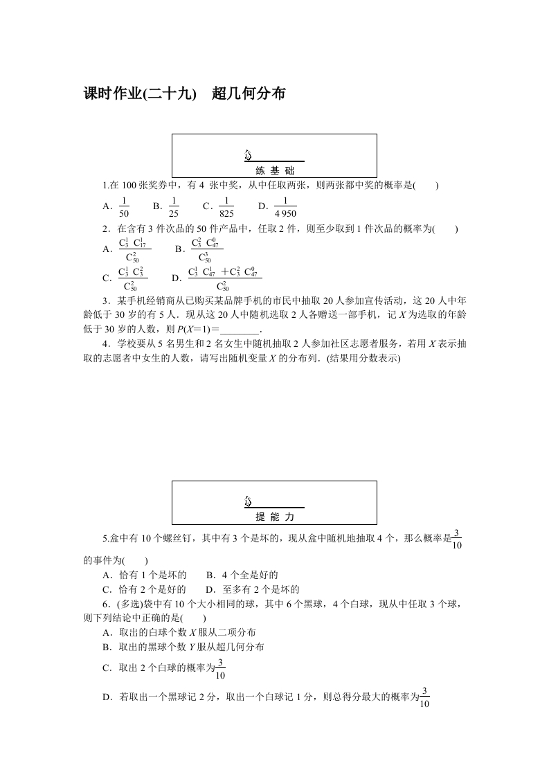 学生啦:课时作业(二十九)超几何分布练基础1.在100张奖券中,有4张中奖,从中任取两张,则两张都中奖的概率是()50B1825D.49502.在含有3件次品的50件产品中,任取2件,则至少取到1件次品的概率为()A.B.CCC3.某手机经销商从己购买某品牌手机的市民中抽取20人参加宣传活动,这20人中年龄低于30岁的有5人.现从这20人中随机选取2人各赠送一部手机,记X为选取的年龄低于30岁的人数,则P(X=1)=4.学校要从5名男生和2名女生中随机抽取2人参加社区志愿者服务,若用X表示抽取的志愿者中女生的人数,请写出随机变量X的分布列.(结果用分数表示)提能力5盒中有10个螺丝钉,其中有3个是坏的,现从盒中随机地抽取4个,那么概率是10的事件为()A.恰有1个是坏的B.4个全是好的C.恰有2个是好的D.至多有2个是坏的6.(多选)袋中有10个大小相同的球,其中6个黑球,4个白球,现从中任取3个球,则下列结论中正确的是()A,取出的白球个数X服从二项分布B.取出的黑球个数Y服从超几何分布C.取出2个白球的概率为,10D.若取出一个黑球记2分,取出一个白球记1分,则总得分最大的概率为10