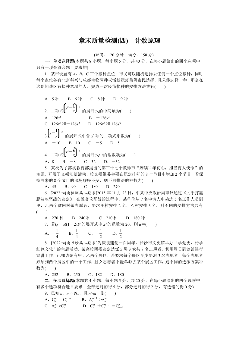 学生啦:章末质量检测(四)计数原理(时间:120分钟满分:150分)一、单项选择题(本题共8小题,每小题5分,共40分,在每小题给出的四个选项中,只有一项是符合题目要求的)1.某市设置有A,B,C三个接种点位,市民可以随机选择去任何一个点位接种,同时每个点位备有北京科兴与成都生物两种灭活新冠疫苗供市民选择,且只能选择一种.那么在这期间该区有接种意愿的人,完成一次疫苗接种的安排方法共有()A.5种B.6种C.8种D.9种2.二项式的展开式的中间项为(B.-126x3C.126r6和-126r3D.1265和126x3的展开式中含x3项的二项式系数为(A.-10B.10C.-5D.54.二项式的展开式中的常数项为()A.8B.-8C.32D.-325.某校为了落实教育部提出的第三十七个教师节“赓续百年初心,担当育人使命”的主题,开展了文娱汇演活动.校文娱组委会要在原定排好的8个节目中增加2个节目,若保持原来的8个节目的出场顺序不变,则不同排法的种数为()A.45B.90C.180D.2706.[2022·湖南株洲高二期末]2015年11月23日,中共中央政治局审议通过《关于打赢脱贫攻坚战的决定》,在脱贫攻坚战的过程中,某单位从7名申请人中挑选5名工作人员到甲、乙两个贫困村做志愿者,要求甲村安排2名,乙村安排3名,则不同的安排方法共有A.270种B.240种C.210种D.180种7.若(x-a1一2x)5的展开式中x3的系数为20,则a=()8.[2022·湖南长沙高二期末]为庆祝建党一百周年,长沙市文史馆举办“学党史,传承红色文化”的主题活动,某高校团委决定选派5男3女共8名志愿者,利用周日到该馆进行宣讲工作.己知该馆有甲、乙两个展区,若要求每个展区至少要派3名志愿者,每个志愿者必须到两个展区中的一个工作,且女志愿者不能单独去某个展区工作,则不同的选派方案种数为()A.252B.250C.182D.180二、多项选择题(本题共4小题,每小题5分,共20分.在每小题给出的四个选项中,有多个选项符合题目要求.全部选对的得5分,部分选对的得2分,有选错的得0分)9.己知,m∈N+,且n>m,则()C.A>C