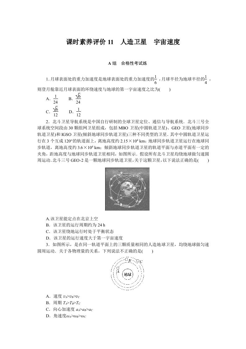 学生啦:课时素养评价11人造卫星宇宙速度A组合格性考试练1.月球表面处的重力加速度是地球表面处的重力加速度的,月球半径为地球半径的则登月舱靠近月球表面的环绕速度与地球的第一宇宙速度之比为(B.36241122.北斗卫星导航系统是中国自行研制的全球卫星定位、通信与导航系统.北斗三号全球系统空间段由30颗组网卫星组成,包括MBO卫星(中圆轨道卫星)、GEO卫星(地球同步轨道卫星)和IGS0卫星(倾斜地球同步轨道卫星)三种不同类型的卫星.其中中圆轨道卫星运行在3个互成120°的轨道面上,离地高度约2.15×10km:地球同步轨道卫星运行在地球同步轨道,离地高度约3.6×10km:倾斜地球同步轨道卫星的轨道平面与赤道平面有一定的夹角,距地高度与地球同步轨道卫星相同,如图所示.假设所有北斗卫星均绕地球做匀速圆周运动.北斗三号GE02是一颗地球同步轨道卫星,关于这颗卫星,以下说法正确的是()A.该卫星能定点在北京上空B.该卫星的运行周期约为24hC.该卫星绕地运行时处于平衡状态D.该卫星的运行速度大于第一宇宙速度3.如图所示,是在同一轨道平面上的三颗质量相同的人造地球卫星,均绕地球做匀速圆周运动.关于各物理量的关系,下列说法不正确的是(A.速度VV8-0CB.周期T>T>TcC.向心加速度aPaa>ac