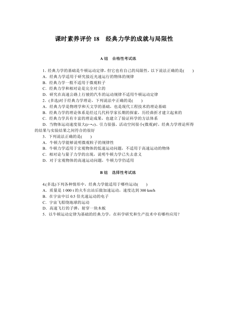 学生啦:课时素养评价18经典力学的成就与局限性A组合格性考试练1.经典力学的基础是牛顿运动定律,但它也有自己的局限性,以下说法正确的是()A.经典力学适用于研究接近光速运行的物体的规律B.经典力学一般不适用于微观粒子C.经典力学和相对论是完全对立的D.研究在高速公路上行驶的汽车的运动规律不适用牛顿运动定律2.(多选)对于经典力学理论,下列说法中正确的是()A.经典力学是物理学和天文学的基础,也是现代工程技术的理论基础B.经典力学的理论体系是经过几代科学家长期的探索,历经曲折才建立起来的C.经典力学具有丰富的理论成果,也建立了验证科学的方法体系D.当物体运动速度很大(心→c)、引力很强、活动空间很小(微观)时,经典力学理论所得的结果与实验结果之间符合的很好3.下列说法正确的是()A.牛顿力学能够说明微观粒子的规律性B.牛顿力学适用于宏观物体的低速运动问题,不适用于高速运动的物体C.相对论与量子力学的出现,说明牛顿力学已失去意义D.对于宏观物体的高速运动问题,牛顿力学仍适用B组选择性考试练4.(多选)下列各种情形中,经典力学能适用于哪些运动()A.质量是1000t的火车出站后做加速运动,速度达到300kmhB.在宇宙中以0.5倍光速运动的电子C.宇宙飞船绕地球的运动D.高速飞行的子弹,射穿一块木板5.以牛顿运动定律为基础的经典力学,在科学研究和生产技术中有哪些应用?