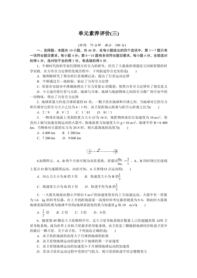 学生啦:单元素养评价(三)(时间:75分钟满分:100分)一、选择题:本题共10小题,共46分.在每小题给出的四个选项中,第1~7题只有一项符合题目要求,每小题4分;第8~10题有多项符合题目要求,每小题6分,全部选对的得6分,选对但不全的得3分,有选错的得0分.1.牛顿时代的科学家们围绕万有引力的研究,经历了大量曲折顽强而又闪烁智慧的科学实践.在万有引力定律的发现历程中,下列叙述符合史实的是()A.伽利略研究了第谷的行星观测记录,提出了行星运动定律B.牛顿通过月一地检验,验证了万有引力定律C.哈雷在实验室中准确地得出了引力常量G的数值,使得万有引力定律有了现实意义D.卡文迪许将行星与太阳、地球与月球、地球与地面物体之间的引力推广到宇宙中的一切物体,得出了万有引力定律2.地球质量大约是月球质量的81倍,一颗卫星在地球和月球之间.当地球对它的引力和月球对它的引力大小之比为4:1时,该卫星距地心距离与距月心距离之比为()A.2:9B.9:2C.1:81D.81:13.一物体在地面上受到的重力大小G为16N,现把物体放在以加速度为10m/s2,竖直向上做匀加速直线运动的火箭中,取地面重力加速度大小g=10m2,地球半径R=6400a,当物体对火箭的压力为20N时,则火箭离地的高度为()A.6400 km B.3 200 kmC.7 200 km D.9600 km4,如图所示,A、B两个天体可视为双星系统,质量比m=三,A、B同时绕它们连线mB 1上某点O做匀速圆周运动,由此可知,A天体绕O点运动的()A.向心力大小为B的3倍B.角速度大小为B的C.线速度大小为B的3倍D.轨道半径为B的5.一火箭从地面由静止开始以5ms2的加速度竖直向上匀加速运动,火箭中有一质量为1.6g的科考仪器,在上升到距地面某一高度时科考仪器的视重为9N,则此时火箭离地球表面的距离为地球半径的(地球表面处的重力加速度g取10ms2()A.日倍B.2倍C.3倍D.4倍26.随着第49颗北斗卫星顺利升空,北斗卫星导航系统在数量上己经超越美国GPS卫星导航系统,成为世界上在轨卫星最多的导航系统.该卫星是三颗倾斜地球同步轨道卫星中的最后一颗卫星,关于该卫星,下列说法正确的是()A,该卫星距地面的高度大于月球到地球的距离B.该卫星绕地球运动的速度小于地球的第一宇宙速度C.该卫星绕地球运动的加速度小于月球绕地球运动的加速度D.若该卫星在运动过程中受到空气阻力,则卫星的轨道半径会慢慢变大