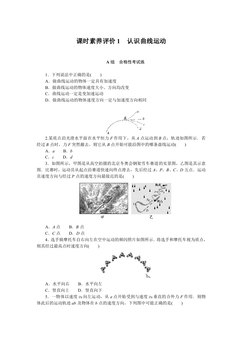学生啦:课时素养评价1认识曲线运动A组合格性考试练1.下列说法中正确的是(A.做曲线运动的物体一定具有加速度B.做曲线运动的物体速度大小、方向均改变C.曲线运动一定是变加速运动D.做曲线运动的物体速度方向一定与加速度方向相同2.某质点沿光滑水平面在水平恒力F作用下,从A点运动到B点,轨迹如图所示.若经过B点时,力F突然撤去,则它从B点开始可能沿图中的哪条虚线运动()A.a B.bC.c D.d3.如图所示,甲图是从高空拍摄的北京冬奥会钢架雪车赛道的实景图,乙图是其示意图.比赛时,运动员从起点沿赛道快速向终点滑去,先后经过A、P、B、C、D五点,运动员速度方向与经过P点的速度方向最接近的是()起点A.A点B.B点C.C点D.D点4.选手骑摩托车自右向左在空中运动的频闪照片如图所示,将选手和摩托车视为质点,则其经过最高点时速度方向(A.水平向右B.水平向左C.竖直向上D.竖直向下5.一物体以速度u向左运动,从a点开始受到与速度垂直的合外力F作用.则物体此后的运动轨迹b及物体在b点的速度方向,下列图中可能正确的是()