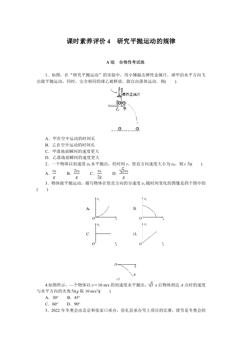 学生啦:课时素养评价4研究平抛运动的规律A组合格性考试练1.如图,在“研究平抛运动”的实验中,用小锤敲击弹性金属片,球甲沿水平方向飞出做平抛运动,同时,完全相同的球乙被释放,做自由落体运动。则()乙甲A.甲在空中运动的时间长B.乙在空中运动的时间长C.甲落地前瞬间的速度更大D.乙落地前瞬间的速度更大2.一个物体以初速度%水平抛出,经时间t,竖直方向速度大小为a,则t为()B.2D.2g2gg3.物体做平抛运动,描写物体在竖直方向的分速度随时间变化的图像是四个图中的4.如图所示,一个物体以v=10ms的初速度水平抛出,V5s后物体到达A点时的速度与水平方向的夹角为(g取10m/s2()A.30°B.45°C.60°D.90°5.2022年冬奥会由北京和张家▣承办,崇礼县承办香上项目的比赛,滑香是冬奥会的