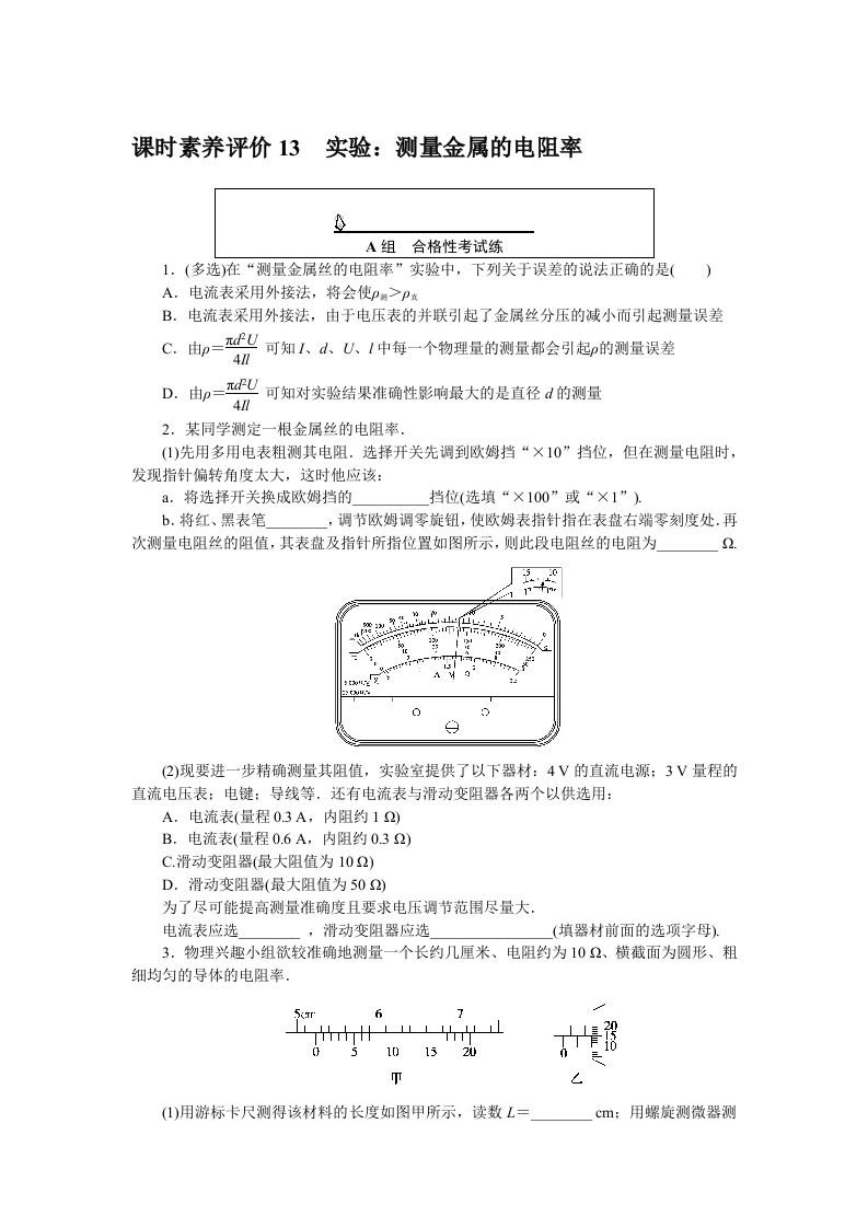 学生啦:课时素养评价13实验:测量金属的电阻率A组合格性考试练1.(多选)在“测量金属丝的电阻率”实验中,下列关于误差的说法正确的是(A.B.电流表采用外接法,由于电压表的并联引起了金属丝分压的减小而引起测量误差C.由p=巴可知人、d,U、1中每一个物理量的测量都会引起p的测量误差可知对实验结果准确性影响最大的是直径d的测量2.某同学测定一根金属丝的电阻率,(1)先用多用电表粗测其电阻.选择开关先调到欧姆挡“×10”挡位,但在测量电阻时,发现指针偏转角度太大,这时他应该:a.将选择开关换成欧姆挡的挡位(选填“×100”或“×1”).b.将红、黑表笔,调节欧姆调零旋钮,使欧姆表指针指在表盘右端零刻度处.再次测量电阻丝的阻值,其表盘及指针所指位置如图所示,则此段电阻丝的电阻为21(2)现要进一步精确测量其阻值,实验室提供了以下器材:4V的直流电源:3V量程的直流电压表:电键:导线等.还有电流表与滑动变阻器各两个以供选用:A.电流表(量程0.3A,内阻约12)B.电流表(量程0.6A,内阻约032)C.滑动变阻器(最大阻值为102)D.滑动变阻器(最大阻值为502)为了尽可能提高测量准确度且要求电压调节范围尽量大,电流表应选,滑动变阻器应选(填器材前面的选项字母).3.物理兴趣小组欲较准确地测量一个长约几厘米、电阻约为102、横截面为圆形、粗细均匀的导体的电阻率510152U(1)用游标卡尺测得该材料的长度如图甲所示,读数L三cm:用螺旋测微器测