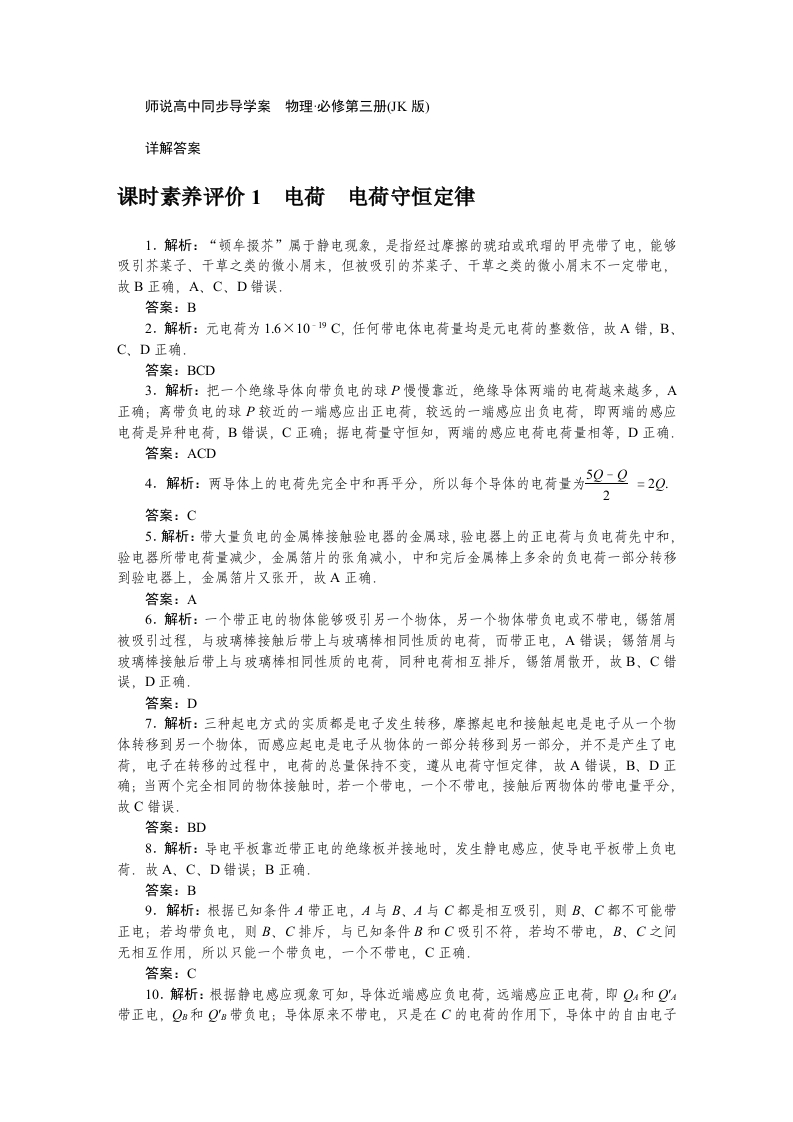 学生啦:师说高中同步导学案物理必修第三册K版)详解答案课时素养评价1电荷电荷守恒定律1.解析:“顿牟掇芥”属于静电现象,是指经过摩擦的琥珀或玳瑁的甲壳带了电,能够吸引芥菜子、干草之类的微小屑末,但被吸引的芥菜子、干草之类的微小屑末不一定带电,故B正确,A、C、D错误答案:B2.解析:元电荷为1.6×1019C,任何带电体电荷量均是元电荷的整数倍,故A错,B、C、D正确.答案:BCD3.解析:把一个绝缘导体向带负电的球P慢慢靠近,绝缘导体两端的电荷越来越多,A正确;离带负电的球P较近的一端感应出正电荷,较远的一端感应出负电荷,即两端的感应电荷是异种电荷,B错误,C正确:据电荷量守恒知,两端的感应电荷电荷量相等,D正确,答案:ACD4.解析:两导体上的电荷先完全中和再平分,所以每个导体的电荷量为卫卫=202答案:C5.解析:带大量负电的金属棒接触验电器的金属球,验电器上的正电荷与负电荷先中和,验电器所带电荷量减少,金属箔片的张角减小,中和完后金属棒上多余的负电荷一部分转移到验电器上,金属箔片又张开,故A正确.答案:A6.解析:一个带正电的物体能够吸引另一个物体,另一个物体带负电或不带电,锡箔屑被吸引过程,与玻璃棒接触后带上与玻璃棒相同性质的电荷,而带正电,A错误;锡箔屑与玻璃棒接触后带上与玻璃棒相同性质的电荷,同种电荷相互排斥,锡箔屑散开,故B、C错误,D正确.答案:D7.解析:三种起电方式的实质都是电子发生转移,摩擦起电和接触起电是电子从一个物体转移到另一个物体,而感应起电是电子从物体的一部分转移到另一部分,并不是产生了电荷,电子在转移的过程中,电荷的总量保持不变,遵从电荷守恒定律,故A错误,B、D正确;当两个完全相同的物体接触时,若一个带电,一个不带电,接触后两物体的带电量平分,答案:BD8.解析:导电平板靠近带正电的绝缘板并接地时,发生静电感应,使导电平板带上负电答案:B9.解析:根据已知条件A带正电,A与B、A与C都是相互吸引,则B、C都不可能带正电;若均带负电,则B、C排斥,与已知条件B和C吸引不符,若均不带电,B、C之间无相互作用,所以只能一个带负电,一个不带电,C正确.答案:C10.解析:根据静电感应现象可知,导体近端感应负电荷,远端感应正电荷,即Q和Q4带正电,Q和Q'带负电;导体原来不带电,只是在C的电荷的作用下,导体中的自由电子