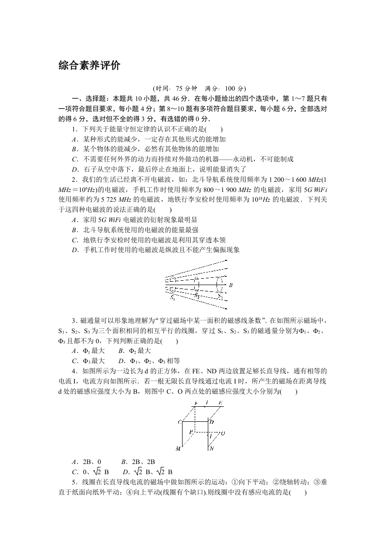 学生啦:综合素养评价(时间:75分钟满分:100分)一、选择题:本题共10小题,共46分.在每小题给出的四个选项中,第1~7题只有一项符合题目要求,每小题4分;第8~10题有多项符合题目要求,每小题6分,全部选对的得6分,选对但不全的得3分,有选错的得0分.1.下列关于能量守恒定律的认识不正确的是()A.某种形式的能减少,一定存在其他形式的能增加B.某个物体的能减少,必然有其他物体的能增加C.不需要任何外界的动力而持续对外做功的机器一永动机,不可能制成D.石子从空中落下,最后停止在地面上,说明能量消失了2.我们的生活已经离不开电磁波,如:北斗导航系统使用频率为1200一1600H(1Mz=10H)的电磁波,手机工作时使用频率为800~1900M的电磁波,家用5GFi使用频率约为5725M的电磁波,地铁行李安检时使用频率为101H的电磁波.下列关于这四种电磁波的说法正确的是()A.家用5G预F电磁波的衍射现象最明显B.北斗导航系统使用的电磁波的能量最强C.地铁行李安检时使用的电磁波是利用其穿透本领D.手机工作时使用的电磁波是纵波且不能产生偏振现象に-3.磁通量可以形象地理解为“穿过磁场中某一面积的磁感线条数”,在如图所示磁场中,S1、S2、S为三个面积相同的相互平行的线圈,穿过S、S2、S3的磁通量分别为、D2、D且都不为0,下列判断正确的是()4.如图所示为一边长为d的正方体,在FE、ND两边放置足够长直导线,通有相等的电流【,电流方向如图所示.若一根无限长直导线通过电流【时,所产生的磁场在距离导线处的磁感应强度大小为B,则图中C、O两点处的磁感应强度大小分别为()A.2B、0B.2B、2BC.0、5BD.V2B、V2B5.线圈在长直导线电流的磁场中做如图所示的运动:①向下平动:②绕轴转动:③垂直于纸面向纸外平动:④向上平动(线圈有个缺口).则线圈中没有感应电流的是()