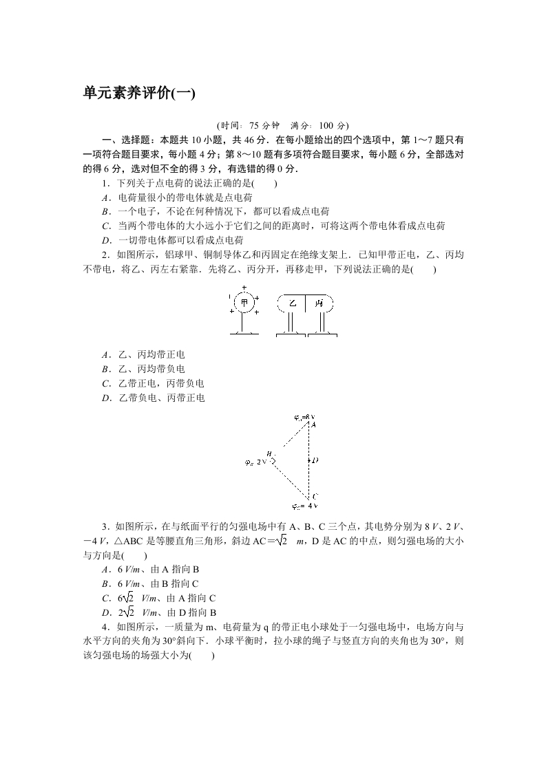 学生啦:单元素养评价(一)(时间:75分钟满分:100分)一、选择题:本题共10小题,共46分.在每小题给出的四个选项中,第1~7题只有一项符合题目要求,每小题4分;第8~10题有多项符合题目要求,每小题6分,全部选对的得6分,选对但不全的得3分,有选错的得0分.1.下列关于点电荷的说法正确的是()A.电荷量很小的带电体就是点电荷B.一个电子,不论在何种情况下,都可以看成点电荷C.当两个带电体的大小远小于它们之间的距离时,可将这两个带电体看成点电荷D.一切带电体都可以看成点电荷2.如图所示,铝球甲、铜制导体乙和丙固定在绝缘支架上,己知甲带正电,乙、丙均不带电,将乙、丙左右紧靠.先将乙、丙分开,再移走甲,下列说法正确的是()A.乙、丙均带正电B.乙、丙均带负电C.乙带正电,丙带负电D.乙带负电、丙带正电+3.如图所示,在与纸面平行的匀强电场中有A、B、C三个点,其电势分别为8V、2V、一4V,△ABC是等腰直角三角形,斜边AC=2m,D是AC的中点,则匀强电场的大小与方向是()A.6Vm、由A指向BC.62Wm、由A指向CD.22Wm、由D指向B4.如图所示,一质量为m、电荷量为q的带正电小球处于一匀强电场中,电场方向与水平方向的夹角为30°斜向下,小球平衡时,拉小球的绳子与竖直方向的夹角也为30°,则该匀强电场的场强大小为()