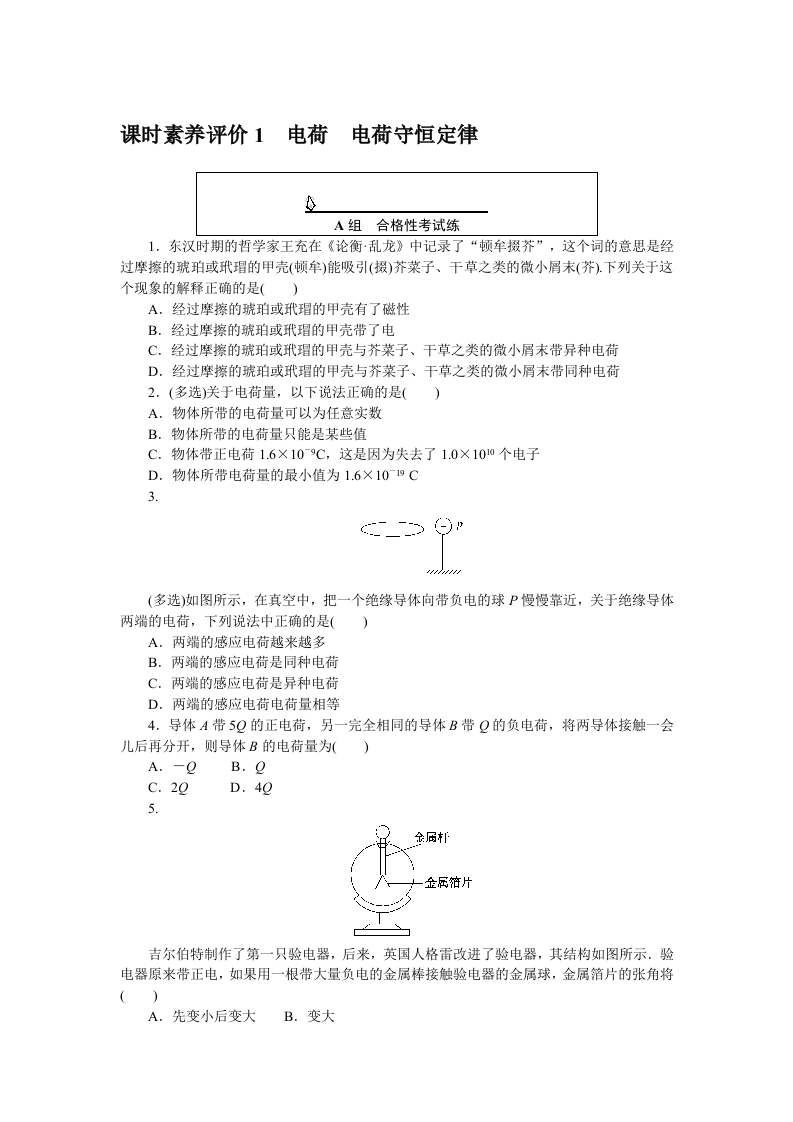 学生啦:课时素养评价1电荷电荷守恒定律A组合格性考试练1.东汉时期的哲学家王充在《论衡·乱龙》中记录了“顿牟掇芥”,这个词的意思是经过摩擦的琥珀或玳瑁的甲壳(顿牟)能吸引(掇)芥菜子、干草之类的微小屑末(芥).下列关于这个现象的解释正确的是()A.经过摩擦的琥珀或玳瑁的甲壳有了磁性B.经过摩擦的琥珀或玳瑁的甲壳带了电C.经过摩擦的琥珀或玳瑁的甲壳与芥菜子、干草之类的微小屑末带异种电荷D.经过摩擦的琥珀或玳瑁的甲壳与芥菜子、干草之类的微小屑末带同种电荷2.(多选)关于电荷量,以下说法正确的是()A.物体所带的电荷量可以为任意实数B.物体所带的电荷量只能是某些值C.物体带正电荷1.6×109C,这是因为失去了1.0×100个电子D.物体所带电荷量的最小值为1.6×109C(多选)如图所示,在真空中,把一个绝缘导体向带负电的球P慢慢靠近,关于绝缘导体两端的电荷,下列说法中正确的是()A.两端的感应电荷越来越多B.两端的感应电荷是同种电荷C.两端的感应电荷是异种电荷D.两端的感应电荷电荷量相等4.导体A带5Q的正电荷,另一完全相同的导体B带Q的负电荷,将两导体接触一会儿后再分开,则导体B的电荷量为()A.-B.5.吉尔伯特制作了第一只验电器,后来,英国人格雷改进了验电器,其结构如图所示.验电器原来带正电,如果用一根带大量负电的金属棒接触验电器的金属球,金属箔片的张角将A.先变小后变大B.变大