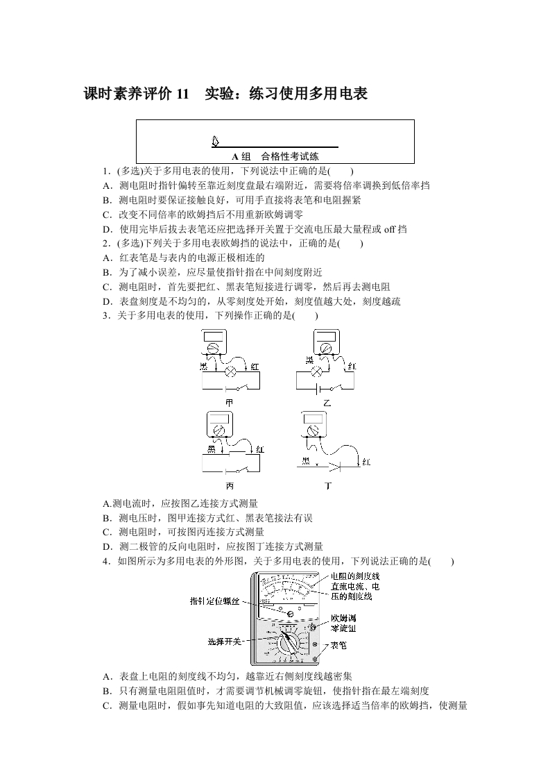学生啦:课时素养评价11实验:练习使用多用电表A组合格性考试练1.(多选)关于多用电表的使用,下列说法中正确的是()A.测电阻时指针偏转至靠近刻度盘最右端附近,需要将倍率调换到低倍率挡B.测电阻时要保证接触良好,可用手直接将表笔和电阻握紧C.改变不同倍率的欧姆挡后不用重新欧姆调零D.使用完毕后拔去表笔还应把选择开关置于交流电压最大量程或of挡2.(多选)下列关于多用电表欧姆挡的说法中,正确的是(A.红表笔是与表内的电源正极相连的B.为了减小误差,应尽量使指针指在中间刻度附近C.测电阻时,首先要把红、黑表笔短接进行调零,然后再去测电阻D.表盘刻度是不均匀的,从零刻度处开始,刻度值越大处,刻度越疏3.关于多用电表的使用,下列操作正确的是(A.测电流时,应按图乙连接方式测量B.测电压时,图甲连接方式红、黑表笔接法有误C.测电阻时,可按图丙连接方式测量D.测二极管的反向电阻时,应按图丁连接方式测量4.如图所示为多用电表的外形图,关于多用电表的使用,下列说法正确的是()电阻的刻度线选挥开关A.表盘上电阻的刻度线不均匀,越靠近右侧刻度线越密集B.只有测量电阻阻值时,才需要调节机械调零旋钮,使指针指在最左端刻度C.测量电阻时,假如事先知道电阻的大致阻值,应该选择适当倍率的欧姆挡,使测量