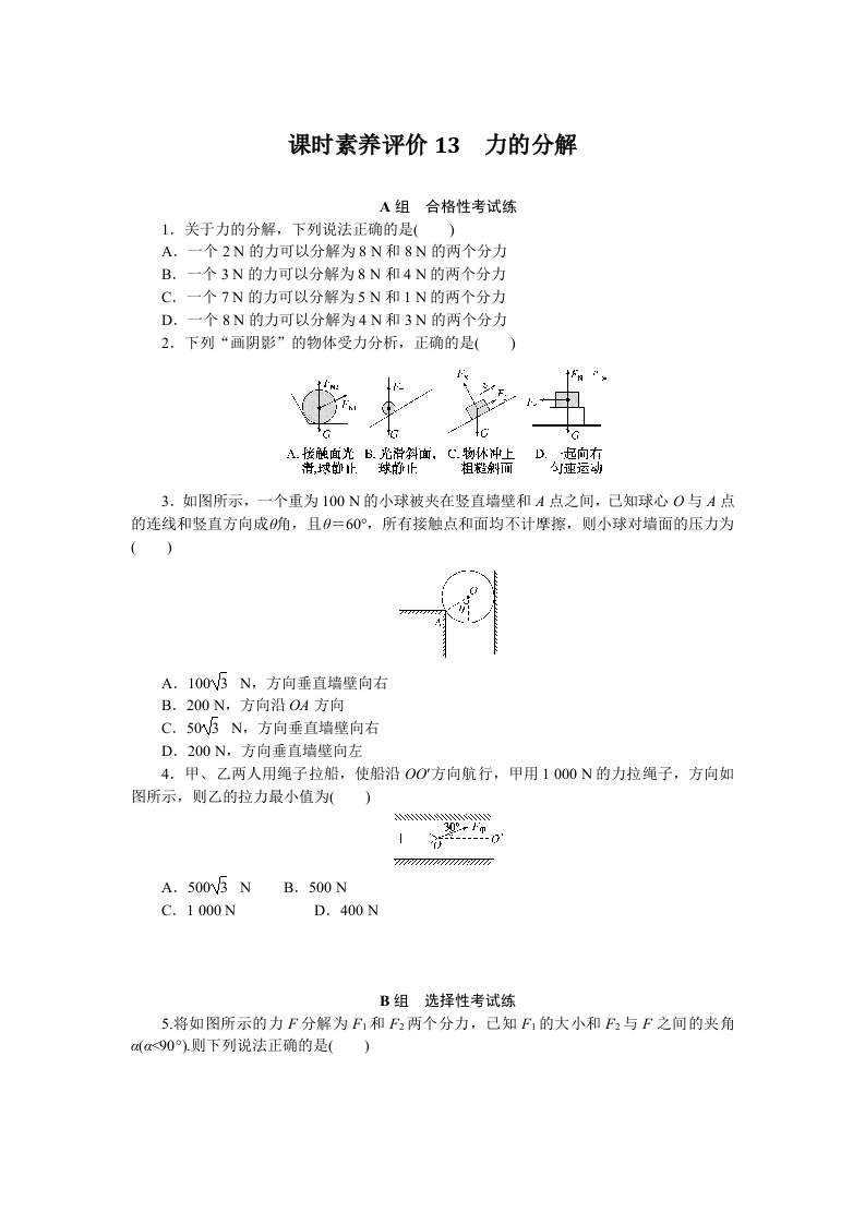 学生啦:课时素养评价13力的分解A组合格性考试练1.关于力的分解,下列说法正确的是()A.一个2N的力可以分解为8N和8N的两个分力B.一个3N的力可以分解为8N和4N的两个分力C.一个7N的力可以分解为5N和1N的两个分力D.一个8N的力可以分解为4N和3N的两个分力2.下列“画阴影”的物体受力分析,正确的是(GG粗趋斜而3.如图所示,一个重为100N的小球被夹在竖直墙壁和A点之间,已知球心O与A点的连线和竖直方向成角,且0=60°,所有接触点和面均不计摩擦,则小球对墙面的压力为()A.100W3N,方向垂直墙壁向右B.200N,方向沿OA方向C.503N,方向垂直墙壁向右D.200N,方向垂直墙壁向左4.甲、乙两人用绳子拉船,使船沿OO方向航行,甲用1000N的力拉绳子,方向如图所示,则乙的拉力最小值为()B.500 NC.1000ND.400NB组选择性考试练5.将如图所示的力F分解为F和F2两个分力,己知F的大小和F2与F之间的夹角a(a<90).则下列说法正确的是()