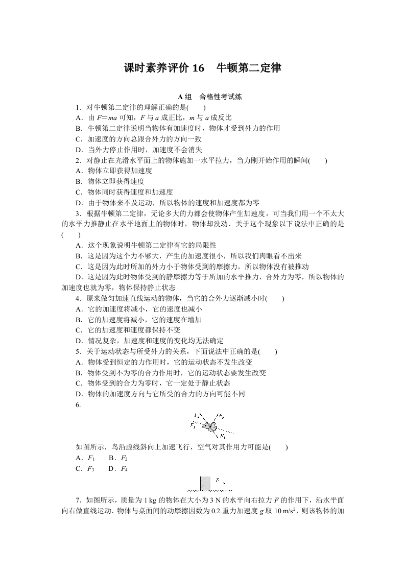 学生啦:课时素养评价16牛顿第二定律A组合格性考试练1.对牛顿第二定律的理解正确的是()A.由F=ma可知,F与a成正比,m与a成反比B.牛顿第二定律说明当物体有加速度时,物体才受到外力的作用C.加速度的方向总跟合外力的方向一致D.当外力停止作用时,加速度不会消失2.对静止在光滑水平面上的物体施加一水平拉力,当力刚开始作用的瞬间()A,物体立即获得加速度B.物体立即获得速度C.物体同时获得速度和加速度D.由于物体来不及运动,所以物体的速度和加速度都为零3.根据牛顿第二定律,无论多大的力都会使物体产生加速度,可当我们用一个不太大的水平力推静止在水平地面上的物体时,物体却没动,关于这个现象以下说法中正确的是A.这个现象说明牛顿第二定律有它的局限性B.这是因为这个力不够大,产生的加速度很小,所以我们肉眼看不出来C.这是因为此时所加的外力小于物体受到的摩擦力,所以物体没有被推动D.这是因为此时物体受到的静摩擦力等于所加的水平推力,合外力为零,所以物体的加速度也就为零,物体保持静止状态4.原来做匀加速直线运动的物体,当它的合外力逐渐减小时()A.它的加速度将减小,它的速度也减小B.它的加速度将减小,它的速度在增加C.它的加速度和速度都保持不变D.情况复杂,加速度和速度的变化均无法确定5.关于运动状态与所受外力的关系,下面说法中正确的是(A.物体受到恒定的力作用时,它的运动状态不发生改变B.物体受到不为零的合力作用时,它的运动状态要发生改变C.物体受到的合力为零时,它一定处于静止状态D.物体的加速度方向与它所受的合力的方向可能不同6.如图所示,鸟沿虚线斜向上加速飞行,空气对其作用力可能是()A.F B.F27.如图所示,质量为1kg的物体在大小为3N的水平向右拉力F的作用下,沿水平面向右做直线运动.物体与桌面间的动摩擦因数为02.重力加速度g取10ms2,则该物体的加