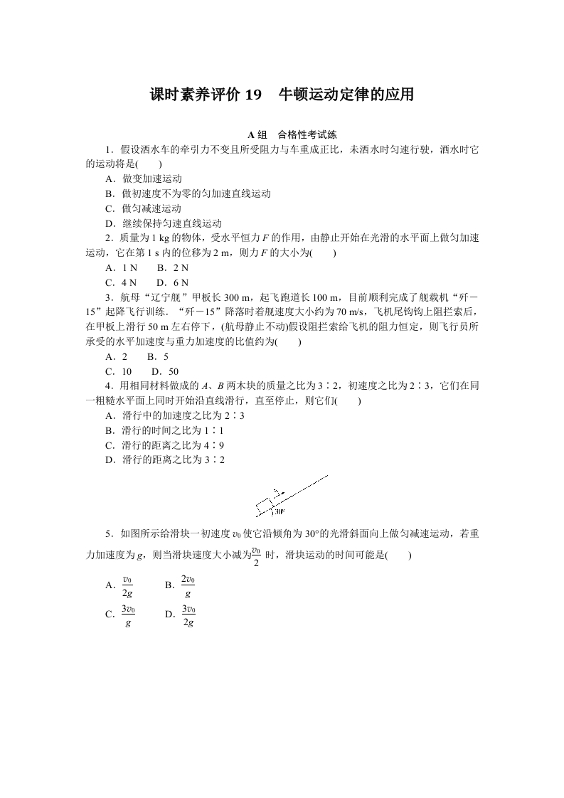 学生啦:课时素养评价19牛顿运动定律的应用A组合格性考试练1.假设洒水车的牵引力不变且所受阻力与车重成正比,未洒水时匀速行驶,洒水时它的运动将是()A,做变加速运动B.做初速度不为零的匀加速直线运动C.做匀减速运动D.继续保持匀速直线运动2.质量为1kg的物体,受水平恒力F的作用,由静止开始在光滑的水平面上做匀加速运动,它在第1s内的位移为2m,则力F的大小为()A.IN B.2NC.4N D.6N3.航母“辽宁舰”甲板长300m,起飞跑道长100m,目前顺利完成了舰载机“歼一15”起降飞行训练.“歼一15”降落时着舰速度大小约为70ms,飞机尾钩钩上阻拦索后,在甲板上滑行50m左右停下,(航母静止不动)假设阻拦索给飞机的阻力恒定,则飞行员所承受的水平加速度与重力加速度的比值约为()A.2B.5C.10D.504.用相同材料做成的A、B两木块的质量之比为3:2,初速度之比为2:3,它们在同一粗糙水平面上同时开始沿直线滑行,直至停止,则它们()A.滑行中的加速度之比为2:3B.滑行的时间之比为1:1C.滑行的距离之比为4:9D.滑行的距离之比为3:25.如图所示给滑块一初速度0使它沿倾角为30°的光滑斜面向上做匀减速运动,若重力加速度为g,则当滑块速度大小减为%时,滑块运动的时间可能是()B.2gC.3D.32g