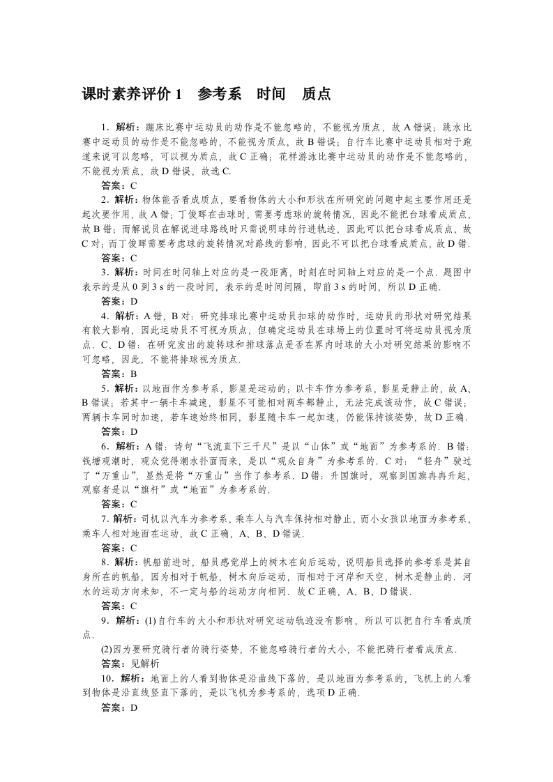 学生啦:课时素养评价1参考系时间质点1.解析:蹦床比赛中运动员的动作是不能忽略的,不能视为质点,故A错误;跳水比赛中运动员的动作是不能忽略的,不能视为质点,故B错误;自行车比赛中运动员相对于跑道来说可以忽略,可以视为质点,故C正确:花样游泳比赛中运动员的动作是不能忽略的,不能视为质点,故D错误,故选C.答案:C2.解析:物体能否看成质点,要看物体的大小和形状在所研究的问题中起主要作用还是起次要作用,故A错:丁俊晖在击球时,需要考虑球的旋转情况,因此不能把台球看成质点,故B错:而解说员在解说进球路线时只需说明球的行进轨迹,因此可以把台球看成质点,故C对:而丁俊晖需要考虑球的旋转情况对路线的影响,因此不可以把台球看成质点,故D错,答案:C3.解析:时间在时间轴上对应的是一段距离,时刻在时间轴上对应的是一个点,题图中表示的是从0到3s的一段时间,表示的是时间间隔,即前3s的时间,所以D正确答案:D4.解析:A错,B对:研究排球比赛中运动员扣球的动作时,运动员的形状对研究结果有较大影响,因此运动员不可视为质点,但确定运动员在球场上的位置时可将运动员视为质点,C、D错:在研究发出的旋转球和排球落点是否在界内时球的大小对研究结果的影响不可忽路,因此,不能将排球视为质点,答案:B5.解析:以地面作为参考系,影星是运动的;以卡车作为参考系,影星是静止的,故A、B错误;若其中一辆卡车减速,影星不可能相对两车都静止,无法完成该动作,故C错误:两辆卡车同时加速,若车速始终相同,影星随卡车一起加速,仍能保持该姿势,故D正确,答案:D6.解析:A错:诗句“飞流直下三千尺”是以“山体”或“地面”为参考系的,B错:钱塘观潮时,观众觉得潮水扑面而来,是以“观众自身”为参考系的.C对:“轻舟”驶过了“万重山”,显然是将“万重山”当作了参考系,D错:升国旗时,观察到国旗冉冉升起,观察者是以“旗杆”或“地面”为参考系的答案:C7.解析:司机以汽车为参考系,乘车人与汽车保持相对静止,而小女孩以地面为参考系,乘车人相对地面在运动,故C正确,A、B、D错误,答案:C8.解析:帆船前进时,船员感觉岸上的树木在向后运动,说明船员选择的参考系是其自身所在的帆船,因为相对于帆船,树木向后运动,而相对于河岸和天空,树木是静止的,河水的运动方向未知,不一定与船的运动方向相同,故C正确,A、B、D错误,答案:C9.解析:(1)自行车的大小和形状对研究运动轨迹没有影响,所以可以把自行车看成质(②)因为要研究骑行者的骑行姿势,不能忽略骑行者的大小,不能把骑行者看成质点,答案:见解析10.解析:地面上的人看到物体是沿曲线下落的,是以地面为参考系的,飞机上的人看到物体是沿直线竖直下落的,是以飞机为参考系的,选项D正确,答案:D