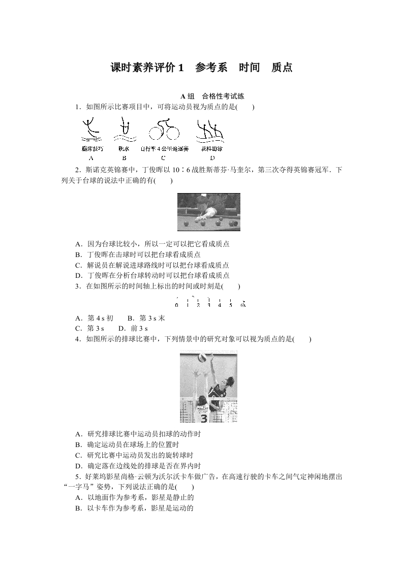 学生啦:课时素养评价1参考系时间质点A组合格性考试练1.如图所示比赛项目中,可将运动员视为质点的是()B2.斯诺克英锦赛中,丁俊晖以10:6战胜斯蒂芬·马奎尔,第三次夺得英锦赛冠军.下列关于台球的说法中正确的有()A.因为台球比较小,所以一定可以把它看成质点B.丁俊晖在击球时可以把台球看成质点C.解说员在解说进球路线时可以把台球看成质点D.丁俊晖在分析台球转动时可以把台球看成质点3.在如图所示的时间轴上标出的时间或时刻是()A.第4s初B.第3s末C.第3sD.前3s4.如图所示的排球比赛中,下列情景中的研究对象可以视为质点的是()3A,研究排球比赛中运动员扣球的动作时B.确定运动员在球场上的位置时C.研究比赛中运动员发出的旋转球时D.确定落在边线处的排球是否在界内时5.好莱坞影星尚格·云顿为沃尔沃卡车做广告,在高速行驶的卡车之间气定神闲地摆出“一字马”姿势,下列说法正确的是()A.以地面作为参考系,影星是静止的B.以卡车作为参考系,影星是运动的
