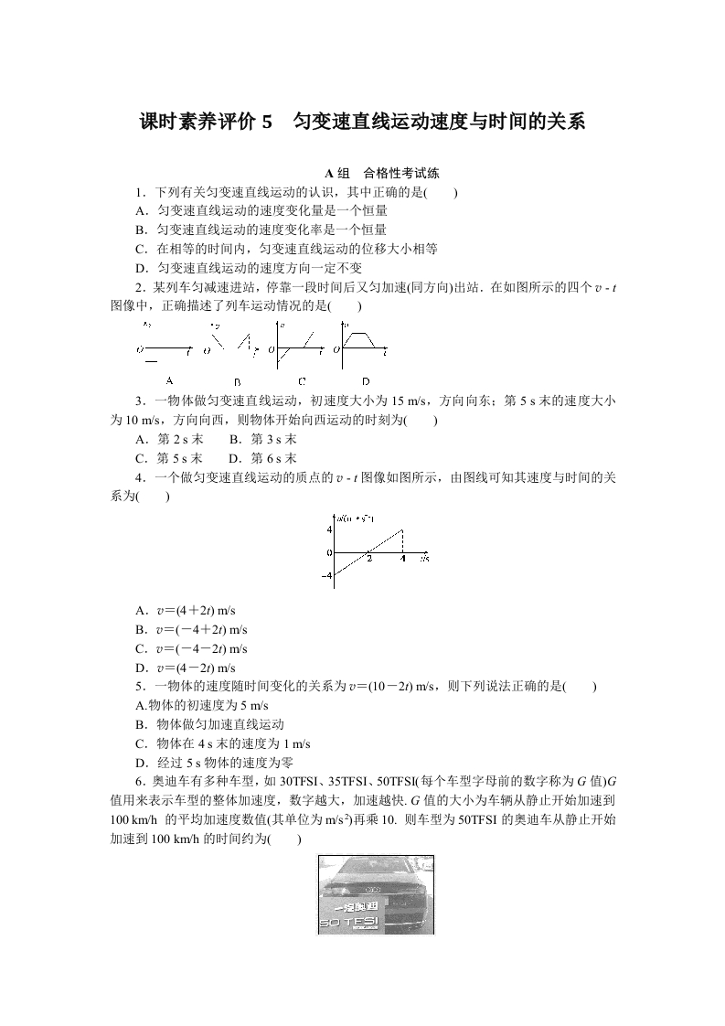 学生啦:课时素养评价5匀变速直线运动速度与时间的关系A组合格性考试练1.下列有关匀变速直线运动的认识,其中正确的是()A.匀变速直线运动的速度变化量是一个恒量B.匀变速直线运动的速度变化率是一个恒量C.在相等的时间内,匀变速直线运动的位移大小相等D.匀变速直线运动的速度方向一定不变2.某列车匀减速进站,停靠一段时间后又匀加速(同方向)出站.在如图所示的四个0,t图像中,正确描述了列车运动情况的是(D3.一物体做匀变速直线运动,初速度大小为15ms,方向向东:第5s末的速度大小为10ms,方向向西,则物体开始向西运动的时刻为()A.第2s末B.第3s末C.第5s末D.第6s末4.一个做匀变速直线运动的质点的?-t图像如图所示,由图线可知其速度与时间的关系为()C.=(-4-2)m/s5.一物体的速度随时间变化的关系为v=(10一2)ms,则下列说法正确的是()A.物体的初速度为5m/sB.物体做匀加速直线运动C.物体在4s末的速度为1msD.经过5s物体的速度为零6.奥迪车有多种车型,如30TFSI、35TFSI、50TFSI(每个车型字母前的数字称为G值)G值用来表示车型的整体加速度,数字越大,加速越快.G值的大小为车辆从静止开始加速到100km/h的平均加速度数值(其单位为ms)再乘10.则车型为50TFSI的奥迪车从静止开始加速到100kmh的时间约为()SO TESI