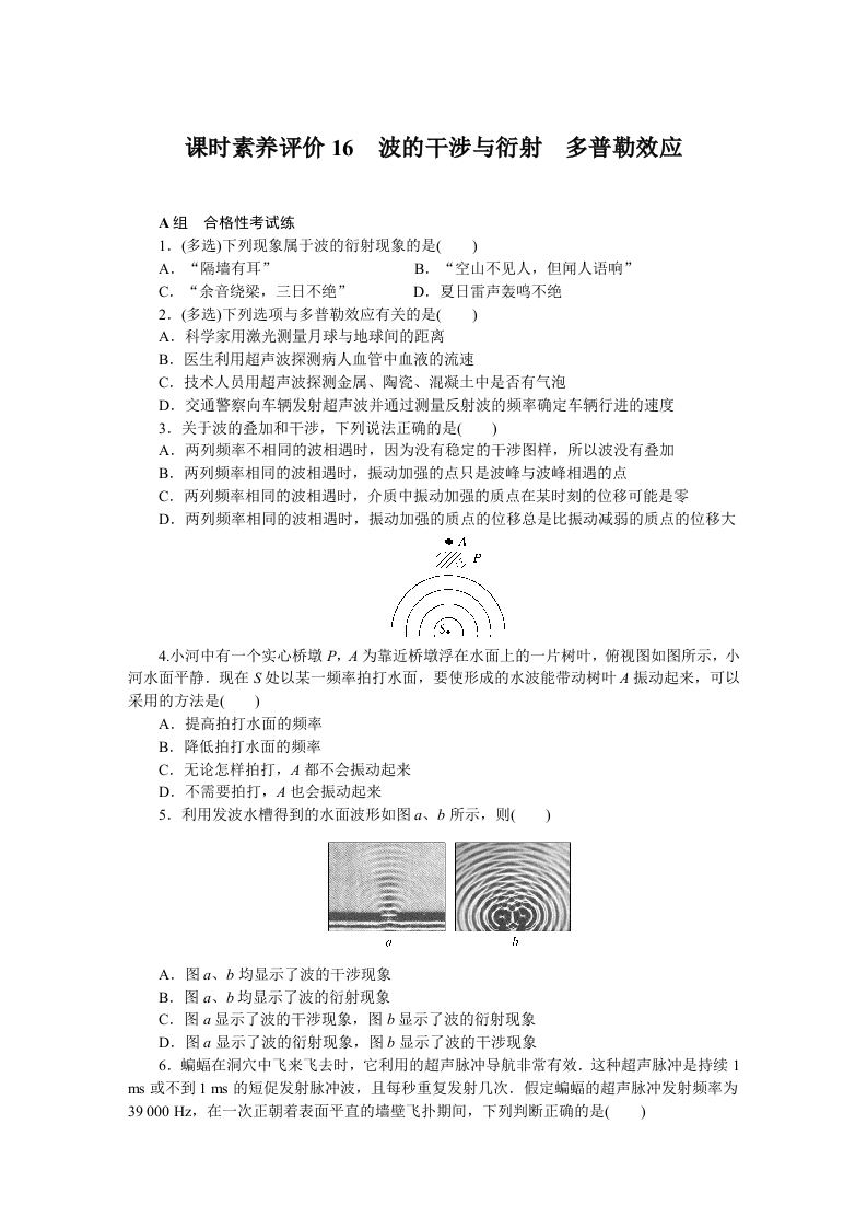 学生啦:课时素养评价16波的干涉与衍射多普勒效应A组合格性考试练1.(多选)下列现象属于波的衍射现象的是()A.“隔墙有耳”B.“空山不见人,但闻人语响”C.“余音绕梁,三日不绝”D.夏日雷声轰鸣不绝2.(多选)下列选项与多普勒效应有关的是()A.科学家用激光测量月球与地球间的距离B.医生利用超声波探测病人血管中血液的流速C.技术人员用超声波探测金属、陶瓷、混凝土中是否有气泡D.交通警察向车辆发射超声波并通过测量反射波的频率确定车辆行进的速度3.关于波的叠加和干涉,下列说法正确的是()A.两列频率不相同的波相遇时,因为没有稳定的干涉图样,所以波没有叠加B.两列频率相同的波相遇时,振动加强的点只是波峰与波峰相遇的点C.两列频率相同的波相遇时,介质中振动加强的质点在某时刻的位移可能是零D.两列频率相同的波相遇时,振动加强的质点的位移总是比振动减弱的质点的位移大4.小河中有一个实心桥墩P,A为靠近桥墩浮在水面上的一片树叶,俯视图如图所示,小河水面平静.现在S处以某一频率拍打水面,要使形成的水波能带动树叶A振动起来,可以采用的方法是()A.提高拍打水面的频率B.降低拍打水面的频率C.无论怎样拍打,A都不会振动起来D.不需要拍打,A也会振动起来5.利用发波水槽得到的水面波形如图a、b所示,则(A.图a、b均显示了波的干涉现象B.图a、b均显示了波的衍射现象C.图a显示了波的干涉现象,图b显示了波的衍射现象D.图a显示了波的衍射现象,图b显示了波的干涉现象6.蝙蝠在同穴中飞来飞去时,它利用的超声脉冲导航非常有效.这种超声脉冲是持续1ms或不到1s的短促发射脉冲波,且每秒重复发射几次.假定蝙蝠的超声脉冲发射频率为39000Hz,在一次正朝着表面平直的墙壁飞扑期间,下列判断正确的是()